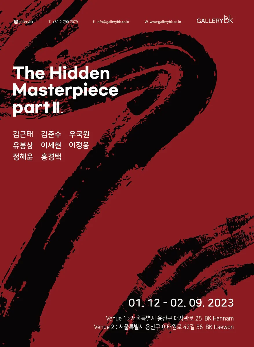 전시 개요 OVERVIEW 서울 한남동 Gallery BK는 지난 2022년 1월, 국내외 미술시장에서 방향성을 제시해온 영향력 있는 14인 거장들의 대규모 그룹전 “The Hidden Masterpiece part I.”을 기획한 바 있다. 1년 전 당시 미술계에 큰 이슈가 되었던 이 전시를 시작으로 2023년 1월, 8인의 중견 및 거장이 함께하는 “The Hidden Masterpiece part II.”를 새롭게 기획하였다. 이번 기획전에 소개되는 8인의 작가들은 국내는 물론 해외 컬렉터들에게도 사랑과 관심을 받음과 동시에 자신만의 화풍으로 견고한 미학의 세계를 알리고 있으며 이들의 활동은 한동안 침체되어 있던 국내 미술 시장에 활력을 불어 넣는 계기를 마련하였다. 거대한 붉은 산수의 형태는 작가 이세현이 스스로 경험하고 인지해온 대상의 모습에 대한 감정 일반을 확장적으로 해부한 뒤 그 과정 그대로 화폭 위에 옮겨 담아낸 것이다. 자신만의 작풍으로 경험의 순간을 투영시키는 방식은 붉거나 푸른, 간혹 찬란한 색을 머금은 채 마음 속 깊은 웅장함을 선사한다. 작가 유봉상은 촘촘한 무두 못(headless pin) 사이 짙게 피어오르는 자연의 이면을 보여줌으로써 사실적 배경 설정과 객관적 세부 묘사를 더해 사색의 시간에 잠영하도록 한다. 단색화의 계보를 잇는 작가 김근태는 석분(돌가루)의 사용으로 재료의 물성을 살리고 물질적 속성에 대한 탐구를 보여준다. 그가 선보이는 화면은 깊이감을 가늠할 수 없을 정도의 켜켜이 쌓아 올려진 물감을 바탕으로 현대적 인간 군상의 의미를 전달하고 있다. 이와 더불어 작가 김춘수의 울트라 마린, 단 하나의 색은 깊은 심연을 연상시키며 무언의 울림을 전달한다. 그는 선과 면의 겹을 쌓아 여러 번의 반복된 행위를 통해 유토피아에 대한 그리움과 갈망, 그리고 자연의 순수성에 대한 끝없는 동경의 의미를 담아낸다. 이렇듯 공간을 가득 채우는 각기 다른 화면들의 조용한 움직임은 거시적으로는 작가들의 견고한 경험을 탐구하게 하고 미시적으로는 그들의 오랜 시간 동안의 단계적 성찰과 사상을 간접적으로 체험하게 함으로 전달자와 체험자의 감정이 결정적인 합을 이루도록 만든다. 고요한 산수 풍경과 잔잔한 물결같은 화면 위로 묵직하고 강하게 지나가는 붓 터치, 작가 이정웅의 ‘stroke’의 흐름이다. 그의 붓 작업은 구상과 추상, 동양과 서양, 실제와 재현의 다양한 개념과 모습이 공존함을 보여주며 감상자에게 새로운 탐미의 기회를 제시하고 있다. 작가 정해윤이 날려 보내는 박새의 날갯짓이 시각적 파동을 불러일으키는 순간 서로 관계를 맺고 살아가는 개별의 삶이 모여 공동체를 이루는 형태로 무리 짓는 광경을 맞이하게 한다. 흐트러짐 없는 오브제의 세밀한 정확도, 화려한 이미지와 색감의 반복은 작가 홍경택의 현대인의 집착적인 욕망과 대중적인 것에 대한 자신만의 첨예한 시각과 관점을 투여한 것으로 리듬감 있는 색채의 향연을 선사한다. 아이의 순수함을 담은 듯한 이미지와 밝고 경쾌한 컬러팔레트를 보여주는 작가 우국원의 작업은 화면 위에 풀어내는 이야기가 자신의 감정으로부터 출발한다는 점과 서정적인 아름다움과 강렬하게 표출되는 의식의 흐름을 상기시킨다는 점에서 화면과 자신 사이의 교감에 얼마나 집중했는지를 보여준다. 근대 미학의 출발점이자 예술철학의 정초로 간주되는 독일의 철학자 임마누엘 칸트(Immanuel Kant, 1724-1804)는 예술가를 감성적 이념의 창조자로 정의하면서 예술 내에는 그 이념이 동반되어 관람자에게 전달되어야 한다고 주장했다. 그가 말하는 감성적 이념이란 상상력의 표상을 의미하는 것으로 어떠한 개념이나 언어도 그 표상에 도달하여 설명하기는 어렵다. 이는 유사한 표상에 대한 전망을 열어줌으로 예술이란 경험을 통해 인지하는 것이 아닌 인간의 인식 능력과 상관없이 그 자체로 보편적이고 이해적이라는 것이다. 작품이라는 전달의 수단 자체가 관람자를 통해 명확히 이해가 되고 그 둘 사이의 합이 정의가 되는 순간이야말로 예술가가 제시하는 선험적 관념을 가장 빠르게 탐미할 수 있는 지름길이 아닐까