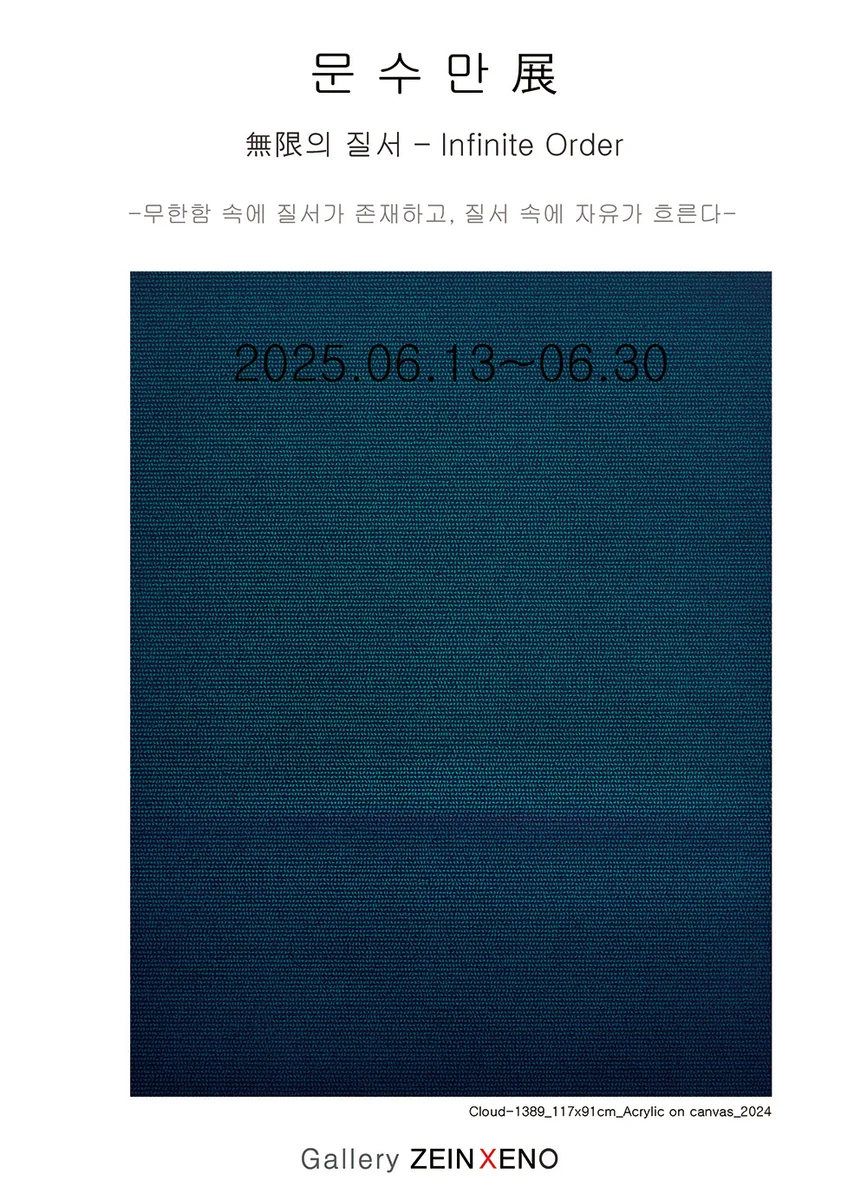 전시 개요 OVERVIEW 전시개요 끊임없이 반복되는 점묘와도 같은 쌀알의 형상은 화면 위에 질서를 만들어낸다. 각각의 쌀은 동일한 형태를 갖고 있으나, 조금씩 어긋나고, 겹쳐지고, 밀려나며 하나의 흐름을 형성한다. 이 행위는 단순한 형식의 축적이 아닌, 시간의 누적이자 행위의 수행이다. 문수만의 작품 속 ‘쌀’은 동양적 맥락에서 삶의 근원이자 순환의 상징이며, 그 반복은 마치 선(禪)의 호흡처럼 조용하고 엄정하다. 동시에, 이러한 반복은 서구 미니멀리즘에서 보이는 기하적 질서와 추상적 구조를 떠올리게 하며, 개념적 층위를 부여한다. 수천 개의 쌀 형태는 화면 위에 집적되어 형태의 규칙성과 감성의 자유로움이 교차하는 공간을 만들어낸다. 이곳은 수행의 흔적이면서, 시각적 사유의 장(場)이다. 작가는 붓으로 그린 쌀알을 통해 ‘무한함 속의 질서’를 시각화하고, 그 안에 담긴 침묵, 고요, 생명성, 그리고 자유를 펼쳐 보인다. 이는 동양과 서양, 전통과 현대, 형식과 개념이 교차하는 회화적 실천이며, 우리가 마주한 한 점 한 점이 결국은 우주의 일부임을 깨닫게 한다. 무한함 속에 질서가 존재하고, 질서 속에 자유가 흐른다.