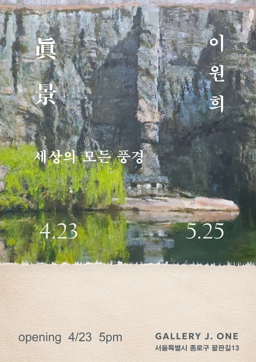 전시 개요 OVERVIEW 🗓 전시 기간: 2026. 04. 23 – 05. 25 ✨ 오프닝 리셉션: 2026. 04. 23(목) PM 5:00 📍 장소: 서울시 종로구 팔판길 13, 갤러리제이원 서울 GALLERY J. ONE Seoul: 확장이전 안내 🏛️ 갤러리 제이원 서울이 예술의 깊은 숨결이 머무는 곳, 팔판동으로 확장이전합니다. 고즈넉한 삼청동의 정취가 이어지는 팔판길 13번지에 새롭게 둥지를 튼 공간은, 2층의 전시장과 도심 속 풍경을 마주할 수 있는 옥상을 갖추어 작품과 관람객이 더욱 입체적으로 소통할 수 있는 환경을 선사합니다. 갤러리 본연의 기능에 충실하도록 설계된 새로운 공간에서, 작품이 주인공이 되는 격조 높은 전시를 이어가겠습니다. 팔판동의 새로운 계절 속에서 곧 여러분을 맞이하겠습니다. “진경(眞景): 세상의 모든 풍경” 이원희의 풍경은 단지 자연을 닮은 그림이 아니다. 그것은 한순간 스쳐 지나간 빛의 결, 산자락을 감싸던 공기의 온도, 물기 어린 대지의 숨결까지 붙들어두려는 깊은 응시의 결과이다. 그의 화면 앞에 서면 우리는 풍경을 본다기보다, 자연이 스스로를 드러내는 고요한 순간과 마주하게 된다. 그의 붓질은 때로 오래된 지층처럼 켜켜이 쌓이고, 때로는 바람이 수면을 스쳐가듯 미세하고도 유연하다. 그렇게 쌓이고 번져가는 색채는 단지 형태를 채우는 데 그치지 않고, 빛과 호흡하며 화면 안에서 또 하나의 시간을 만들어낸다. 그 앞에서 관람자는 멈춘 장면을 보는 것이 아니라, 지금 이 순간에도 조용히 숨 쉬고 있는 자연의 깊은 생동을 체험하게 된다. 이번 전시 《진경: 세상의 모든 풍경》은 전통적인 진경의 정신을 동시대 회화의 언어로 새롭게 불러오는 자리다. 겸재 정선이 우리 산천의 실재하는 아름다움 속에서 시대의 감수성과 정신을 길어 올렸듯, 이원희 또한 오랜 시간 전국의 산천을 직접 마주하며 그 안에 깃든 자연의 다채로운 생을 화폭에 담아왔다. 그러나 그의 진경은 눈앞의 대상을 사실적으로 옮겨 놓는 데 그치지 않는다. 그것은 가시적인 형상 너머에 놓인 시간의 축적, 자연이 품은 내면의 질서, 그리고 존재의 본질에 이르려는 회화적 탐구의 결과라 할 수 있다. 이원희의 풍경은 자연을 단순히 재현한 이미지에 머물지 않는다. 그의 회화는 특정한 장소를 바라보는 시각적 기록인 동시에, 그 순간 자연이 품고 있던 공기와 빛, 습도와 침묵까지 아우르며 존재의 깊이를 환기하는 회화적 장(場)으로 확장된다. 그의 붓질은 때로 지층처럼 중첩되며 시간의 두께를 드러내고, 때로는 바람의 결을 닮은 섬세한 리듬으로 화면을 가로지른다. 화면 위에 펼쳐진 산천은 외형의 충실한 묘사를 넘어, 풍경을 고정된 대상으로 머물게 하지 않고 살아 있는 현존으로 전환시킨다. 자연의 실존을 응시하는 작가의 사유와 감각이 응축된 결과물이다. 특히 이번 갤러리 제이원에서 선보이는 작품들은 이원희 회화가 도달한 고요한 원숙한 리얼리즘과 정신적 깊이를 선명하게 보여준다. 산과 물, 바위와 숲으로 이어지는 그의 시선은 자연이 품고 있는 묵묵한 서사에 향해있다. 그 서사는 요란하게 자신을 드러내지 않지만, 오래 바라볼수록 더욱 깊고 넓은 울림으로 마음에 스민다.