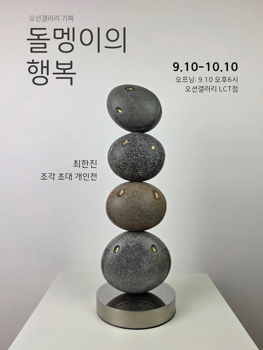 전시 개요 OVERVIEW 전시제목: 돌멩이의 행복 참여작가: 최한진 전시기간: 2025. 9. 10 (수) – 10. 10 (금) 관람시간: 오픈전시 (예약관람 가능) 전시장소: 오션갤러리 LCT점 (부산 해운대구 달맞이길 30 엘시티 더몰 포비움동 3059호) 작품문의: 051-746-6060 / ocgallery@naver.com 누군가에게는 하찮아 보이는 작은 돌멩이도 수억 년의 시간과 인내를 견뎌 지금 이 자리에 있습니다. 돌멩이처럼, 삶의 고난을 이겨내며 단단해져 다이아몬드가 되어가는 우리 모두의 이야기를 담고 있습니다. 잠시 멈춰 서서, 조용한 위로와 스스로의 희망을 찾아가시길 바랍니다. <작가약력> 개인전 2024 열다섯 번째 초대개인展(오모크갤러리/칠곡) 2024 열네 번째 초대개인展(랑랑뮤직월드/중국) 2022 열세 번째 초대개인展(리빈갤러리/부산) 2022 열두번째 초대개인展(Gallery we/용인) 2022 열한 번째 초대개인展(MASS갤러리/서울) 2020 열 번째 초대개인展(맥화랑/부산) 2020 아홉 번째 초대개인展(히든스페이스갤러리/대구) 2019 여덟 번째 초대개인展(강남교보타워/서울) 2016 일곱 번째 초대개인展(갤러리ARTSOOP/부산) 2016 여섯 번째 개인展 (CITE INTERNATIONLE DES ARTS ▪ PARIS) 2015 다섯 번째 초대개인展(EM 갤러리/도쿄) 2014 네 번째 초대개인展(갤러리ARTSOOP/부산) 2011 세 번째 초대개인展(갤러리ART3325/창원) 2011 두 번째 초대개인展(이듬갤러리/부산) 2010 첫 번째 최한진 조각展(해미당갤러리/통영) 그룹전 단체전, 아트페어 등 200여회 수상 2022 한국전업미술가협회-부산지회-전업미술가상 수상(한새갤러리/부산) 2015 7th부산시민회관 청년작가선정(시민회관/부산) 2010 Eco환경조각대전-최우수상-(크라운.해태제과/서울) 2008 미사리조각공모전-장려상-(미사리조정경기장/하남) 2007 ‘대교’전국대학/대학원생조각대전<대학원부문>-대상-(성남아트홀/성남) 2000 전국대학생미술대전-은상-(한국미술협회/대구) 외 14회수상