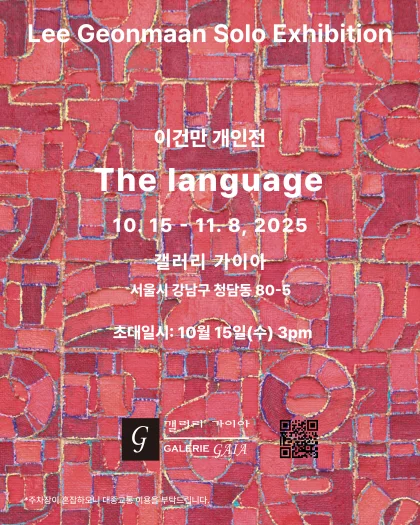 전시 개요 OVERVIEW 이건만 개인전 ‘The language’ Lee Geonmaan Solo Exhibition ‘The language’ 10. 15 – 11. 8, 2025 Galerie GAIA (80-5, Cheongdam-dong, Gangnam-gu, Seoul, Korea) 갤러리가이아 (서울시 강남구 청담동 80-5) *초대일시: 10월 15일(수) 오후 3시 이건만 작가는 ‘글씨(문자)’를 회화적 요소로 다루는 작가로 잘 알려져 있습니다. 그의 작품은 단순한 텍스트가 아니라, ‘글씨를 그리는 회화’, 즉 문자와 이미지의 경계를 넘나드는 실험으로 평가받습니다. 작가는 글씨의 회화화 (Calligraphic Painting)를 시도하여 글자를 읽히게 하기보다 ‘그리는 행위’로 전환하여, 시각적 리듬과 구조로 재해석합니다. 붓의 획, 색의 중첩, 글자의 리듬 자체가 회화의 중심이 되며, 그 안에는 언어 이전의 감정과 사유가 스며 있습니다. 작가는 한글의 자음과 모음이 가지는 구조적 아름다움을 통해, 한국적 미감을 현대적으로 표현하는 조형적 탐구를 합니다.반복된 획과 레이어 속에 사유와 시간의 흐름이 쌓여, ‘글씨를 통한 명상적 행위’로 작품이 완성됩니다. 그의 회화는 시간의 흐름과 기억의 잔향을 담으며, 관객으로 하여금 잠시 멈추어 언어 이전의 문자의 조형미에서 시적인 아름다움을 느끼게 합니다. Artist Lee Geonmaan is widely recognized for his unique approach of treating letters (characters) as painterly elements. His works are not mere texts, but rather “paintings of letters” experiments that transcend the boundaries between language and image. He transforms the act of writing into an act of painting, shifting focus from legibility to visual rhythm and structure. Through the movement of the brush, the layering of colors, and the rhythm of the strokes, the artist reinterprets written language as a visual experience filled with pre-linguistic emotion and contemplation. By exploring the structural beauty inherent in the consonants and vowels of Hangul, Lee engages in a modern reinterpretation of Korean aesthetics. The repetition of brushstrokes and layered forms accumulate thought and time, turning his practice into a meditative act of “writing through painting.” His paintings embody the flow of time and the lingering echoes of memory, inviting viewers to pause and experience the poetic beauty of letters — beyond their meanings, within their pure visual form. <작품 설명> 이건만 작가의 작업은 텍스트와 이미지가 뒤섞인 현대 시각 환경 속에서, 우리가 ‘실상’이라 여기는 현실이 어떻게 언어와 시각 정보에 의해 구성되는지를 탐구한다. 특히, 한글이라는 문자 체계를 해체하고 재조합하는 과정을 통해, 언어가 단순한 미 전달의 도구가 아니라 조형 요소로 기능할 수 있음을 실험한다. 작업은 자음과 모음을 분리하고, 그 순서를 재배열한 후