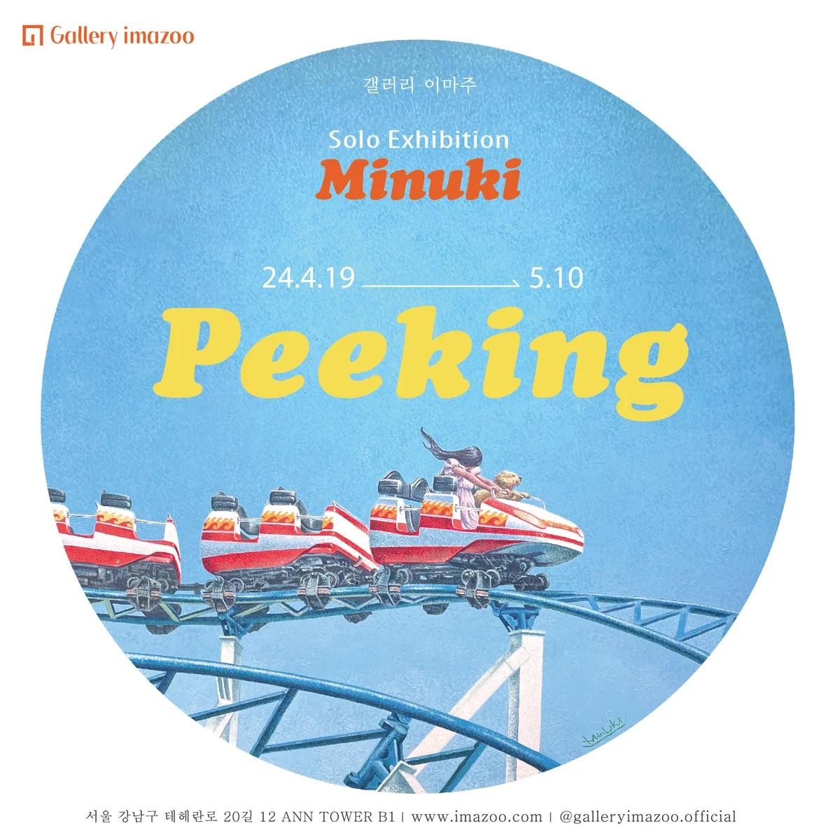 전시 개요 OVERVIEW 오는 4월 19일 부터 5월 10일 까지 갤러리 이마주에서 민우기 작가의 개인전 ‘Peeking’이 시작된다. 민우기 작가의 작업은 현대인의 평온한 일상 속 모습을 통해 예측 불가능한 삶 속에 무의식적으로 내재되어 있는 불안감과 함께 일상의 소중함을 표현하고 있다. 작품의 첫 인상은 여유롭고 평화로운 일상 속 찰나를 비교적 안전하고 잘 정돈된 구도로 포착한 모습이다. 낯 설 다기 보다는 너무나 익숙하고 당연한 것들이어서 오히려 기억에 잘 남지 않는 순간들이다. 작가의 작업은 원형 캔버스의 구조적 특성으로 인해 타인의 일상을 훔쳐보는 듯한 착각이 들기도 한다. 형식적인 면에서 불안감을 전달하기 위한 작가만의 몇 가지 장치가 있는데, 과장되고 왜곡된 구도와 간혹 등장하는 동물들의 불편한 응시, 점을 찍어 표현한 방식, 그림자의 부재를 들 수 있다. 우선 빛이 있는 한 당연한 그림자를 없애 버림으로써 실제로 존재하지 않을 것 같은 느낌을 주기도 한다. 과장된 투시 도법과 수직, 수평선을 주로 사용해서 기하 도형처럼 표현된 공간과 정면을 응시하고 있는 동물들을 통해서 영화 “트루먼 쇼”의 주인공만 모르는 이곳은 마치 쇼가 벌어지는 가상현실처럼 보이기도 한다. 점으로 표현된 픽셀 같은 이미지는 금방 이라도 흩어져 버릴 것 같은 꿈속처럼 혼란스러움이 가중되며 비현실적인 분위기를 극대화한다. 이번 전시를 통해 무의미하게 느껴졌던 일상의 순간들 그럼에도 각자 주어진 시간을 묵묵히 견뎌내고 있는 우리. 매일 똑같은 일상이지만 오늘의 일상은 살아남은 자의 일상이다. 잠시 나마 민우기 작가의 작품을 통해 소멸하기에 더욱 아름다울 수밖에 없는 우리의 “우아한 일상” 을 발견하는 시간이 되었으면 한다.