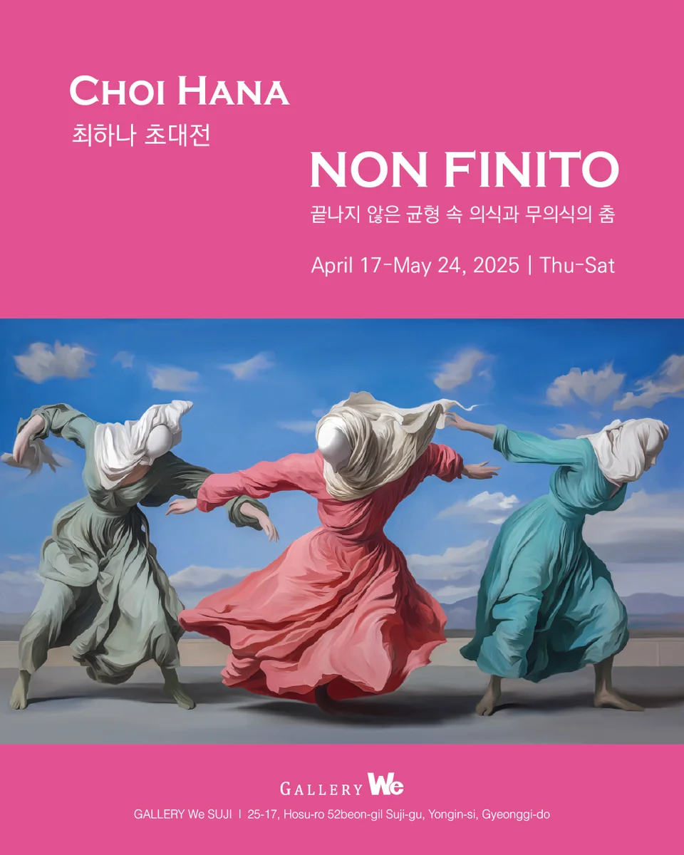 전시 개요 OVERVIEW Non Finito(논 피니토). 의도적으로 작품을 완성하지 않은 상태를 말한다. 단순한 미완성이 아닌, 창작의 과정 자체를 작품의 일부로 포함하는 개념이다. 형태가 다듬어지지 않은 부분을 통해 역설로 창작의 과정에 대한 생생한 긴장감, 조형적 잠재성을 부여한다. 갤러리위 수지에서 열리는 최하나 초대전 ‘Non Finito’에서 완성과 미완성의 경계, 편안함과 불편함 사이의 갈등을 예술적 에너지로 활용한 젊은 작가의 실험적 탐구를 만날 수 있다. 작가는 철학을 사랑한다. 삶에서 겪는 모든 감정과 물음, 그 사유의 과정이 바로 철학의 본질임을 믿고, 그 믿음을 통해 얻은 존재와 세계에 대한 깊은 이해와 통찰을 캔버스 위 한 장면에 응축한다. 눈을 가린 허무한 손짓은 허상에 갇힌 착각의 심연을 전하고, 타락 천사와 죄인들의 최후의 만찬은 신의 존재에 대한 모순의 굴레에 대해 질문한다. 짙은 파랑과 뉴트럴, 청록과 핑크의 강렬한 색상 조합은 초현실적인 분위기를 끌어올리고, 현실과 비현실이 교차하는 조형 흐름은 꿈속 같은 감정적 이질감과 동시에 환상적 몰입감을 형성한다. 작업은 디지털드로잉으로 시작된다. 디지털드로잉이라는 표현 방식은 작가의 탐구에 중요한 방법론이 된다. 이 현대적 도구는 무의식과 의식의 영역을 결합하는 초현실주의적 접근을 물리적 한계 없이 실현하며, 직접적이고 즉흥적인 내면의 변화를 그대로 담아내는 유연성을 제공한다. 철학적 사유의 과정 자체를 중요시하는 작가에게 드로잉의 과정은 사유의 흐름을 시각화하는 예술적 성찰이다. 예술 작품의 정밀한 보존에 사용되는 Giclée(지클레)로 인쇄한 작품은 오일과 아크릴로 마무리된다. 이 과정을 통해 질감과 깊이를 부여 받고, 빛과 그림자를 흡수하고 반사하는 시각적 풍부함을 완성한다. 최하나의 생경한 화면은 복잡한 감정과 생각의 흐름을 유도한다. ‘의식의 세계는 안락함을 제공하지만, 그 안에 머물면 정체되기 마련이다. 무의식의 세계는 혼란스럽지만, 그곳에서 본질적 에너지를 얻는다. 그러나 둘 중 하나에만 머무를 수 없기에 우리는 늘 그 사이의 균형을 찾아야만 할 것이다.’는 작가의 말처럼 끊임없는 예술적 긴장, 대치되는 얽힌 감정, 모호한 현실 감각의 파동이 그의 작품이 품은 본질적 힘이자 매력이다. ‘Non Finito’는 예술적, 철학적 고백이다. 끊임없이 변화하고 진화하는 젊은 작가의 여정에 함께 하기를 권한다. 갤러리위 수지ㅣ 031.266.3266 gallerywe@gallerywe.com www.gallerywe.com 경기도 용인시 수지구 호수로 52번길 25-17 OPENING HOURS ㅣ TUE-SAT 10AM-6:30PM DAY OFF l SUN-MON, Public Holiday 031.266.3266 ㅣ 쾌적한 관람을 위해 예약(전화, 네이버) 후 방문 가능합니다.