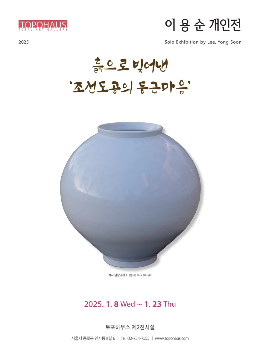 전시 개요 OVERVIEW -일정: 1월 8일 (수) – 23일 (목) -시간: 매일 오전 10시 – 오후 7시 -장소: 토포하우스 제 2전시실 토포하우스 제 2 전시실 전시전경 이용순 작가는 자신이 직접 산에서 채취한 백설기 같은 백토와 직접 만든 유약으로 조선도공의 백자 달항아리를 불러내고 있다. 달항아리들은 사람 얼굴처럼 모두가 다르다. 색도 약간 푸른 기가 도는 설백에서 불투명한 유백까지 스펙트럼이 넓다. 이용순, 백자 달항아리, 46 x 46 cm 단색화의 거장 박서보 화백은 설백의 백자사발이 비워져 있음에도 맑고 푸른 물이 담겨 있는 느낌에 이끌려 달항아리에까지 이르게 됐다고 했다. 이런 맛을 이용순 달항아리는 모두 담아내고 있다. 공간과 빛에 따라 보이는 각양의 얼굴은 카메라에 담기지 않아 천 개의 얼굴을 가졌다는 달항아리의 매력이다. 토포하우스 제 2 전시실 전시전경 드뷔시의 ‘달빛’선율이 어울리고 이해인 수녀의 ‘달빛 기도-한가위에’가 떠올려지는 이용순 달항아리는 순백색의 둥글고 어진 맛이 일품이다. 달항아리 작가 중 최고로 꼽히는 이 작가의 달항아리전이 1월 8일부터 23일까지 인사동 토포하우스에서 열린다.