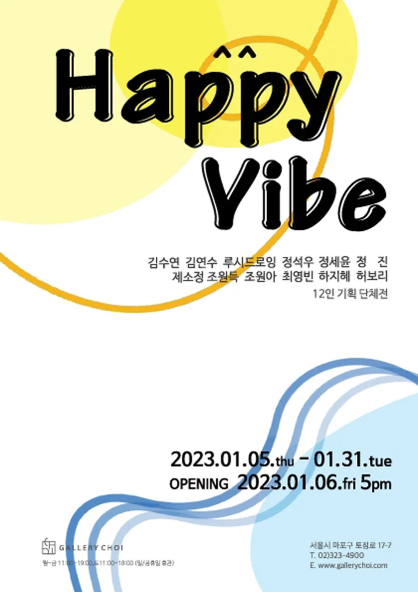 전시 개요 OVERVIEW HAPPY VIBE 12인 젊은 단체전을 시작하며 글. 민규리 SNS를 둘러본다. 행복한 분위기들이 가득하다. 수많은 프레임 속 한 장면에는 많은 이들의 행복이 담겨있다. 이번 새해의 시작도 갤러리 초이라는 장소 속에 행복을 넣어보면 어떨까? 예술과 행복은 공통점이 있다. 많은 사람들은 예술이 어렵다고 말하지만, 예술이란 주변 환경에 대한 아름다움의 가치를 인식하는 것으로 충분한 의미를 가진다. 예술품을 소장하거나 공연장에 가는 등 경제적 수준을 넘어, 예술이라는 것은 긍정적으로 받아들이는 마음가짐에 따라 달렸다. 예술을 통해 일상의 행복을 말하고 싶다. 우리 인생에서 삶과 예술에 의미를 주는 단 한 가지 색은 바로 사랑의 색이다. – 마르크 샤갈 르누아르가 말했듯 예술과 행복의 공통분모는 분위기, 감성, 어떠한 것에 대한 느낌을 오롯이 느끼는 것을 말한다. 모두들 저마다의 행복을 꿈꾸는 것처럼 사람마다 정의내리는 행복의 디테일은 다르겠지만, 행복이라는 철학적 단어에 좋은 느낌을 주는 바이브(Vibe)를 빼놓을 수 없다. 라는 이번 전시의 제목이 여기서 착안되었다. 이번 12명의 젊은 작가들도 저마다의 마음 속 풍경, 기원하는 마음의 모습, 풍자, 삶의 존재와 서사 등을 통해 캔버스에 행복을 표현한다. 아니, 이미 그들은 예술을 하는 행위 자체가 행복일 것이다. 그래서 우리는 행복을 전시하기로 했다. 이 전시를 감상하는 분들 모두 HAPPY VIBE를 느껴보길, 즐거운 일상들이 너무 많아 행복의 의미를 찾게 되길 바라며 글을 마친다.