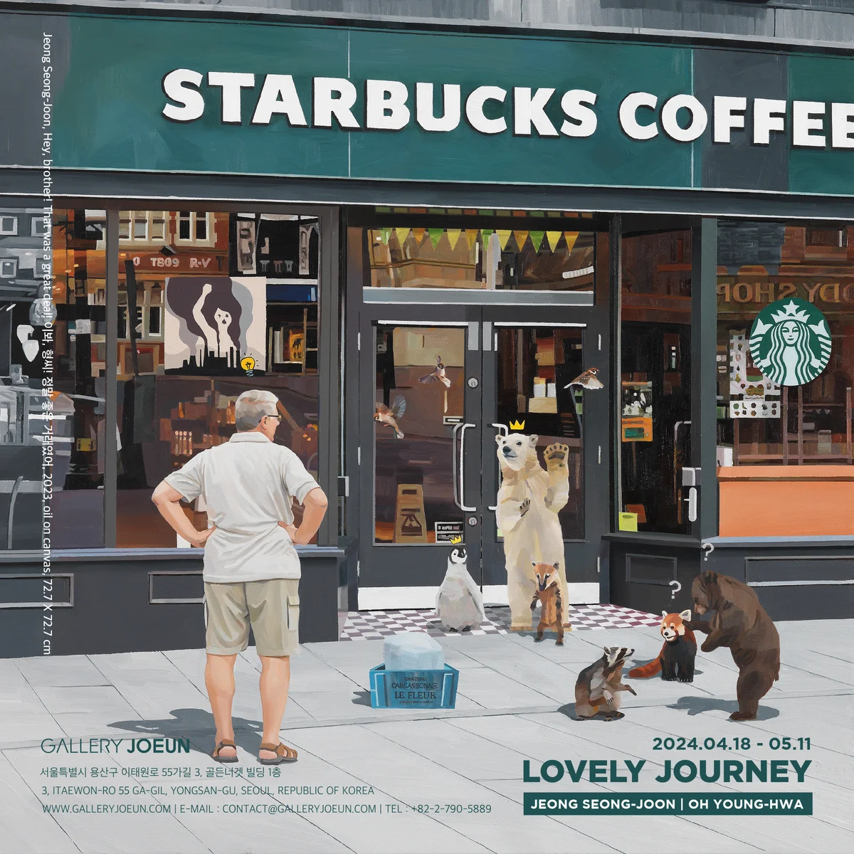 전시 개요 OVERVIEW Jeong Seong-Joon I Oh Young-Hwa 갤러리조은은 정성준(b.1981), 오영화(b.1981)의 2인전 《Lovely Journey》를 4월 18일부터 5월 11일 까지 개최한다. 두 작가는 ‘인간과 동물의 공존’이라는 우리 사회의 환경적 화두를 특유의 조형언어로 표현한다. 정성준은 현실의 도시 풍경 속에 북극곰, 황제 펭귄 등 멸종 위기에 처한 희귀동물들의 여정을 유머러스하게 풀어낸다. 유쾌하고 에너지 넘치는 동물들에 비해 도심 속 무채색의 사람들은 그들에게 특별한 관심을 주지 않는다. 언뜻 보면 공존하고 있는 듯 하지만 생생하고 밝은 색채의 동물들 주변으로 회색 빛의 도시 풍경이 교차하듯 펼쳐진다. 지구 온난화에 직면한 작금의 환경 오염 속에서 어쩌면 영원히 찾을 수 없는 비현실의 ‘유토피아’를 찾아 헤매는 동물들은 회색 빛 도시에 머물러 있는 인간에 비해 어딘가 순진하지만 즐겁고 적극적이다. 이는 환경 문제를 흑백컬러의 재앙적 미래로 풀어내기 보다 언젠가 그림 속에서 모두가 오색 창연한 색으로 공존하기를 바라는 작가의 낙관주의적인 미학적 태도일 것이다. 본 전시에서 작가는 기존 대표 시리즈인 ‘트램’, ‘스타벅스’를 비롯, 도시를 벗어나 나룻배를 타고 망망대해를 가로지르는 인간과 동물의 낭만주의적 여정 ‘The Paradise’를 최초로 공개할 예정이다. 중국 북경 중앙미술학원 유화 석사를 외국인 최초로 수석 졸업한 정성준은 중국과 홍콩, 한국을 오가며 활발한 작품 활동을 이어 오고 있다. 프랑스 루이비통 재단 Fondation Louis Vuitton에 트램 작품이 소장되었을 뿐만 아니라, 중국 최대 부동산 회사 완크어 Vanke에 대형 코끼리 작품 (200 x 650cm) 그리고 최근 한국 박서보 재단 PARKSEOBO Foundation에 총 4점이 연달아 소장되며 국내외 미술계에서 확실히 자리매김 하고 있다. 오는 10월 북경에서 개인전이 예정되어 있다. 정성준이 멸종위기에 처한 동물을 주제로 다루었다면 오영화는 우리네 일상에서 흔히 찾아 볼 수 있는 ‘길 고양이’를 통해 서정적이고 따뜻한 공존의 풍경을 선사한다. 중국 유학 시절, 문화적, 언어적 소통의 단절로 외로웠던 작가에게 ‘길 고양이’는 친구이자 가족이었고, 외국인으로서 낯선 타국에서 살아가는 자기 자신이었다. 어떤 존재보다 큰 위안을 받았던 ‘길 고양이‘를 작품의 주제로 선택한 작가는 누구보다 햇빛을 사랑하지만 늘 어둠 속을 헤매는 처지였던 그들을 빛과 그림자의 찬란한 경계 위에 존재 시킨다. 인간과 함께 따뜻한 봄날의 카페 테라스를 즐기는 ‘Beautiful World’, 뜨거운 태양 빛의 그림자를 오가는 ‘The Scent of Summer’, 안락한 주인의 의자에서 창문 너머 햇살을 만끽하는 ‘The John’s Chair’ 까지 우리네 일상에서 펼쳐지는 고양이들의 다채로운 빛 풍경 속에서 그들은 더 이상 사회적 외면을 받는 존재가 아니라 양지에서 인간과 함께 일상을 공유하는 소중하고 환영 받는 공존의 대상이다. 정성준과 북경 중앙미술학원 동문인 오영화는 중국과 한국을 오가며 작품 활동을 이어 오고 있다. 작년 갤러리조은 단체전 불혹미혹5th을 시작으로 본격적으로 국내 활동에 박차를 가하고 있는 작가는 4월 본 전시에 이어, 5월 아트부산, 10월 북경 개인전을 앞두고 있다. Gallery Joeun is pleased to present the duo exhibition “Lovely Journey” by Jeong Seong-Joon (b.1981) and Oh Young-hwa (b.1981) from April 18 to May 11. The two artists express the environmental theme of our society, the coexistence of humans and animals, with their unique artistic language. Jeong Seong-Joon humorously depicts the journey