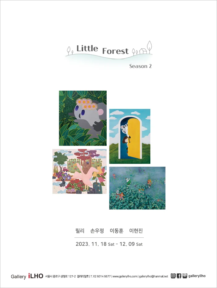 전시 개요 OVERVIEW 갤러리일호는 Little Forest 리틀포레스트라는 주제로 릴리, 손우정, 이동훈, 이현진 4명의 작가와 함께 3주간 기획전을 진행합니다. 현재를 소중히 여기고 소확행을 추구하는 메시지를 작가의 페르소나인 코알라를 통해 바라보는 세상으로 표현하는 릴리 작가, 리넨 위에 오일로 만들어 낸 몽환적인 상상의 공간 안에서의 자신의 본질을 찾아 나가고 대중과의 소통을 시도하는 손우정 작가, 행복한 세상 속에서 걱정 없이 살고 싶은 현대인들의 희망을 동물과 식물, 정물과 추상적 기호 등 여러 가지 요소를 화면에 가득 채우며 이야기를 전달하는 이동훈 작가, 그리고 깊은 숲속 안개가 피어오르는 작가의 개인적인 세상을 타인에게 공개하고 타인은 작가의 숨겨진 세상을 통해 각자마다의 세상을 들여다보는 계기가 되었으면 한다는 이현진 작가까지 4명의 작가의 작품들을 한 곳에서 감상하실 수 있습니다. 작가들이 만들어 낸 상상의 공간 속, 작은 숲속에서 잠시 쉬어가듯 편안하고 의미 있는 시간이 되길 바랍니다.