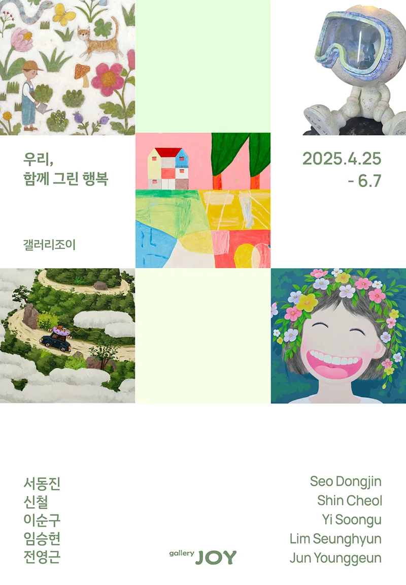전시 개요 OVERVIEW 가정의 달, 5월. 다섯 명의 작가가 전하는 다정한 그림 이야기. 신철, 이순구, 전영근, 임승현, 서동진 작가는 사랑과 그리움, 위로와 웃음이 담긴 다양한 작품들을 통해 우리 삶 속 소중한 감정들을 조용히 꺼내어 보여준다. 어린 시절의 따뜻한 기억, 서로를 향한 다정한 웃음과 말 없는 위로. 길 위에서 마주한 소소한 평온. 불완전함 속에서도 빛나는 우리들의 이야기, 그리고 내면의 성숙과 희망을 담아낸 따뜻한 눈빛. 이번 전시 -우리, 함께 그린 행복-은 그림을 통해 마음을 나누고, 가족과 이웃, 그리고 나 자신을 돌아보는 조용하고 따뜻한 시간을 선물한다. 잠시 멈추어 서서, 우리 안의 따뜻함을 다시 마주해보기 바란다. 부산광역시 해운대구 달맞이길 65번길 56(중동) CK빌딩 1F. 갤러리조이 Tel:051.746.5030 Homepage: http://www.galleryjoy.com