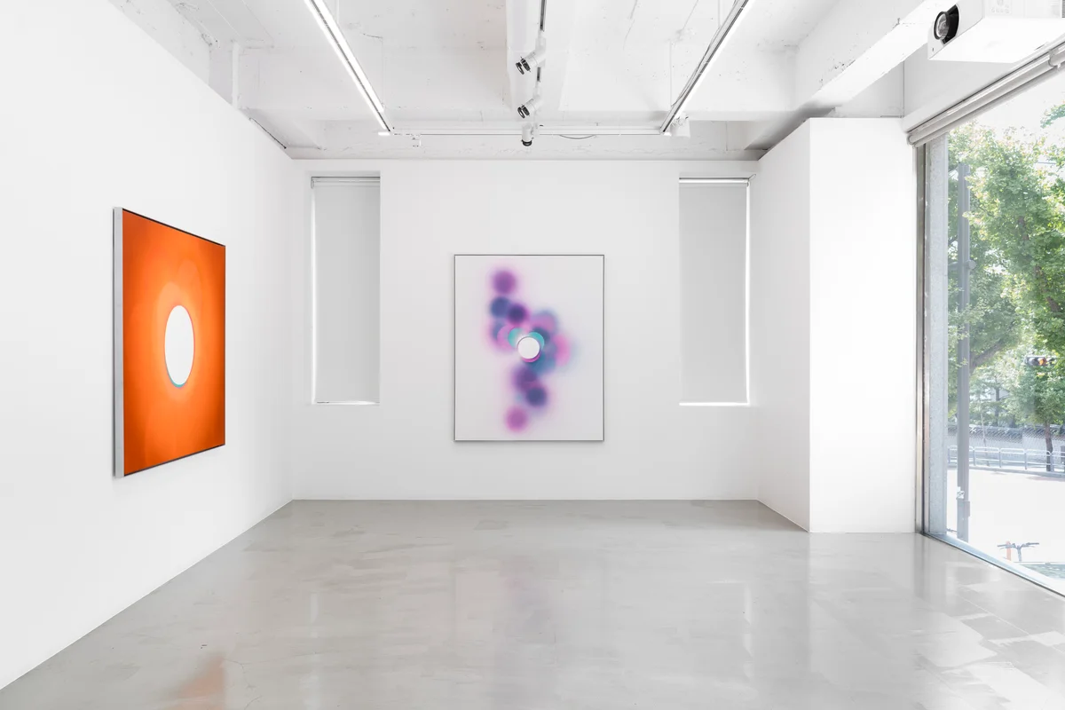 전시 개요 OVERVIEW 갤러리바톤은 최지목(Jimok Choi, b. 1981)의 개인전 《A Hundred Suns(백 개의 태양)》을 2025년 8월 20일부터 9월 20일까지 한남동 전시 공간에서 개최한다. 수년 동안 몰입해 온 “잔상” 시리즈의 형식과 개념이 한층 무르익은 시기에 열리는 이번 전시는, 관객 참여형 퍼포먼스(〈당신의 망막은 나의 캔버스〉)를 아우르며, 작가가 일관되게 추구해 온 “지각적 회화(Perceptual Painting)”의 세계를 심층적으로 탐구할 기회를 선사한다. 괴테의 색채론 『Zur Farbenlehre』(1810)에 기술된 “눈이 태양과 같지 않다면, 우리는 빛을 어떻게 볼 수 있겠는가? 우리들 속에 신 자신의 힘이 살아 있지 않다면, 신성이 우리를 어떻게 매혹시키겠는가?”라는 주장은 최지목의 잔상 시리즈를 이해하는 첫걸음이다. 괴테는 색을 빛의 물리적 속성에 종속시킨 뉴턴의 광학이 지닌 한계를 지적하고, 빛에 노출된 신체 기관의 경험과 감각을 색채의 본질이라고 주장하였다. 특히, 특정 광원에 오래 노출된 후 망막이 즉각적으로 생성하는 보색 잔상(Nachbilder, 적색-녹색, 청색-황색 등) 개념은 작품의 색채 구성과 미학적 구조의 핵심을 형성한다. 전시 제목이 암시하듯이, 최지목의 페인팅은 태양과 마주한 자신의 망막이 형성한 시각적 반응, 보색 잔상에 대한 회화적 아카이빙이다. 태양을 정면으로 응시한 후 눈을 감았을 때 나타나는 형형색색의 환영은 본래의 색과는 전혀 다른 보색으로 나타났다가, 점차 연해지고, 이내 사라진다. “결국, 나는 눈 속의 세계를 그린다”라는 작가의 고백은, 빛이 사라진 자리에서 나타나는 무작위적이고 예측 불가한 환영들이 그가 다루는 대상이자, 안료라는 물질로 번역해야 하는 매체임을 나타낸다. 흥미롭게도 입자이자 파동인 빛의 이중성은 회화의 기교적인 면에서 작가의 작업 방식과 밀접하게 연결되어 있다. 감각에 의존하여 잔상을 묘사함에 있어, 에어 브러쉬는 경계 없는 중첩과 부유하는 듯한 색 덩어리의 비물질적 존재감의 묘사에 있어 탁월하다. 지배적인 잔상은 흐르듯 두텁게, 잔향을 잃어가는 이미지는 색 입자의 엷은 산포로 처리되며, 망막에 “맺히고 사라지는” 이미지의 속성을 시뮬레이션한다. 동시에, 브러시로 캔버스에 물리적인 접촉을 일으키는 부분은 작가가 의도적으로 경계를 구축하고 고착시키는 부분에 집중된다. 빛의 파동이 겹치며 경계가 뚜렷한 간섭무늬를 형성하듯, 브러시로 강조된 이미지들은 감각의 재연을 넘어 순수 추상을 향한 작가의 갈망을 은연중에 드러낸다.