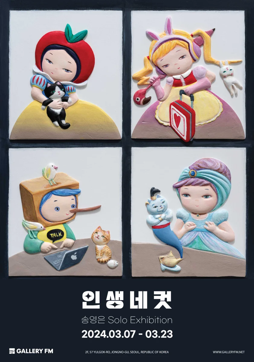 전시 개요 OVERVIEW 특유의 몽환적 분위기와 동화적 캐릭터로 인간의 내면을 은유적으로 표현하는 작가 송영은의 개인전 ‘인생네컷’이 안국역에 위치한 갤러리FM에서 3월 7일부터 27일까지 열린다. 작가가 이번 전시에서 구현해 낸 동화 나라에서는 동심을 간직하면 누구나 주인공이 될 수 있으며 행복의 깊이는 간절함의 크기와 비례하기에 누구에게나 공평할 뿐만 아니라 어떠한 역경 속에서도 결국에는 잘살게 된다는 끝맺음의 법칙이 지켜진다. 그런 의미에서 전시에 등장하는 작품 속 소녀들은 동화의 주인공이자 우리 모두의 동심을 대변하는 상징적 존재이다. 시간을 통제하고 어디든지 여행하는 앨리스, 자정이 되면 남루한 현실로 돌아오는 마법의 유리구두를 벗어던지고 달콤한 축제를 신나게 즐기는 신데렐라, 곤경에 처한 상황에서 왕자님의 도움 없이 스스로 해결하려는 당당한 백설공주, 거짓말이 무엇인지 모른다는 거짓말을 능청스럽게 하는 피노키오 그리고 진정한 용기란 두려움과 친구가 되는 것이라고 말하는 빨간 망토까지. 작가는 기존에 널리 알려진 동화 원작을 도전과 모험이 가득 담긴 스토리로 새롭게 각색한 후 그중에 특별한 장면만을 골라서 네 컷으로 표현했다. 동화와 인생 모두 단 네 컷으로 간추릴 순 없지만 누구에게나 사진으로 남기고 싶을 정도로 찬란하게 빛나는 소중한 순간은 늘 존재하기에 그 최고의 순간을네 컷이라는 제한적인 틀에 담아 강조했다. 이번 전시에서 각자의 인생 안에서 남기고 싶은 네 장면들을 떠올려보며 동화 속에 담긴 꿈을 찾아 즐거운 상상으로 가득한 순간에 머물러 보시기 바란다.