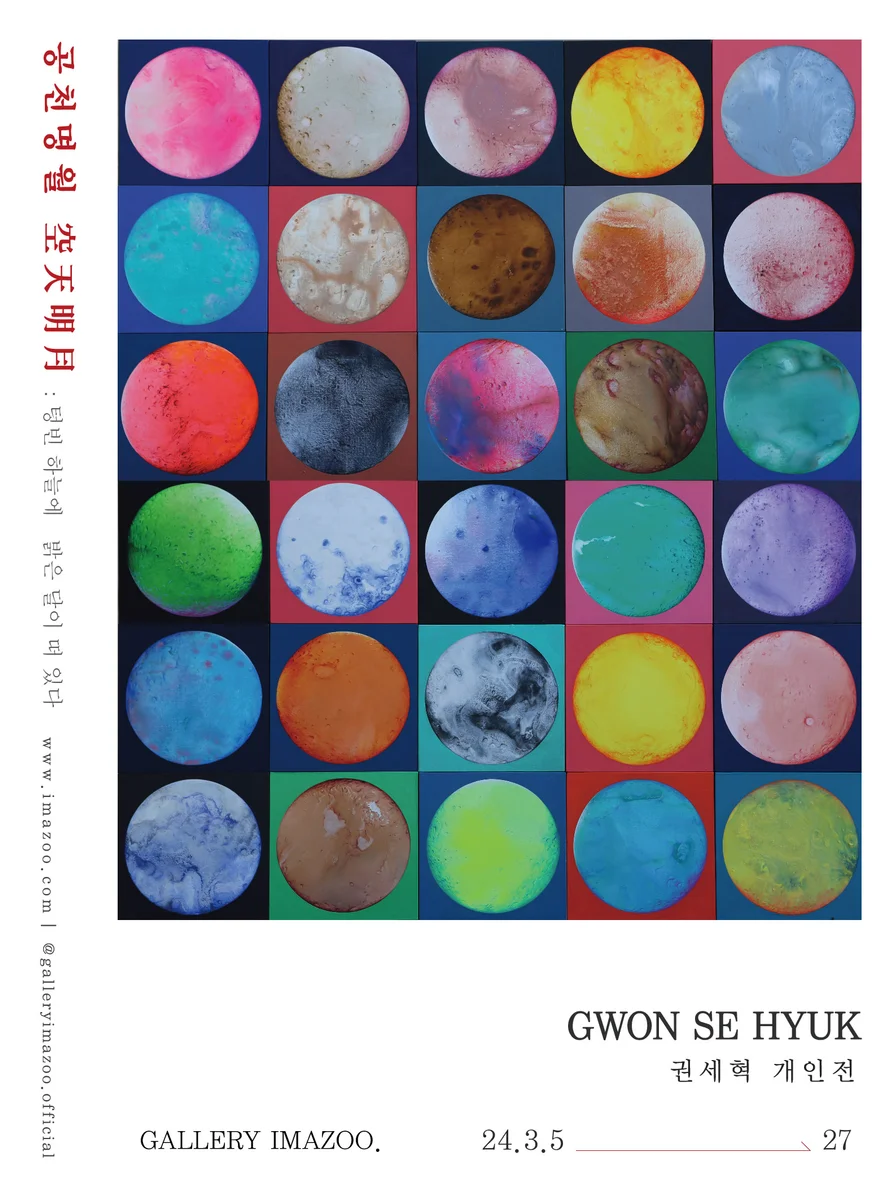 전시 개요 OVERVIEW 오는 3월 5일부터 27일까지 갤러리 이마주에서 권세혁 작가의 개인전 <공천명월>이 시작된다. 이번 전시 제목인 ‘공천명월’은 ‘텅 빈 하늘에 밝은 달이 떠 있다.’ 의 의미를 가졌으며 이는 우리 마음속에 있는 탐욕에 대한 열망을 나타낸다. 작가의 달 작업은 순수한 색채만을 가지고 작업을 해 보자는 의도에서 시작되었다. 기본적인 도형인 사각형과 원의 형상을 기반으로 우연적 효과 바탕에 의도성이 가미된 묘사를 통해 작가가 생각하는 달의 형상을 표현하였다. 입체적인 표현을 최대한 절제하면서 평면적으로 접근하여 작업을 하며, 사각프레임과 원형에 조색과 배색에 대한 문제는 작가가 가지고 있는 색채에 대한 편협 된 관점들을 확인해 보면서 좀 더 확장된 시점으로 색채에 접근해 볼 수 있는 작업이다. 작가가 표현하는 달의 이미지는 몽롱한 꿈 혹은 유희적, 희망적인, 탐욕적인, 관능적인 시도 때도 없이 변하는 변덕스러운 작가의 마음의 이미지다