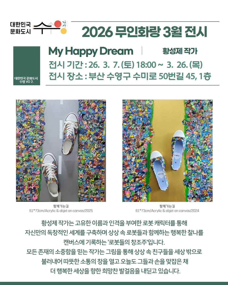 개요 전시 > 부산 전시 기간 2026.03.07.(토) ~ 2026.03.26.(목) 장소 무인화랑