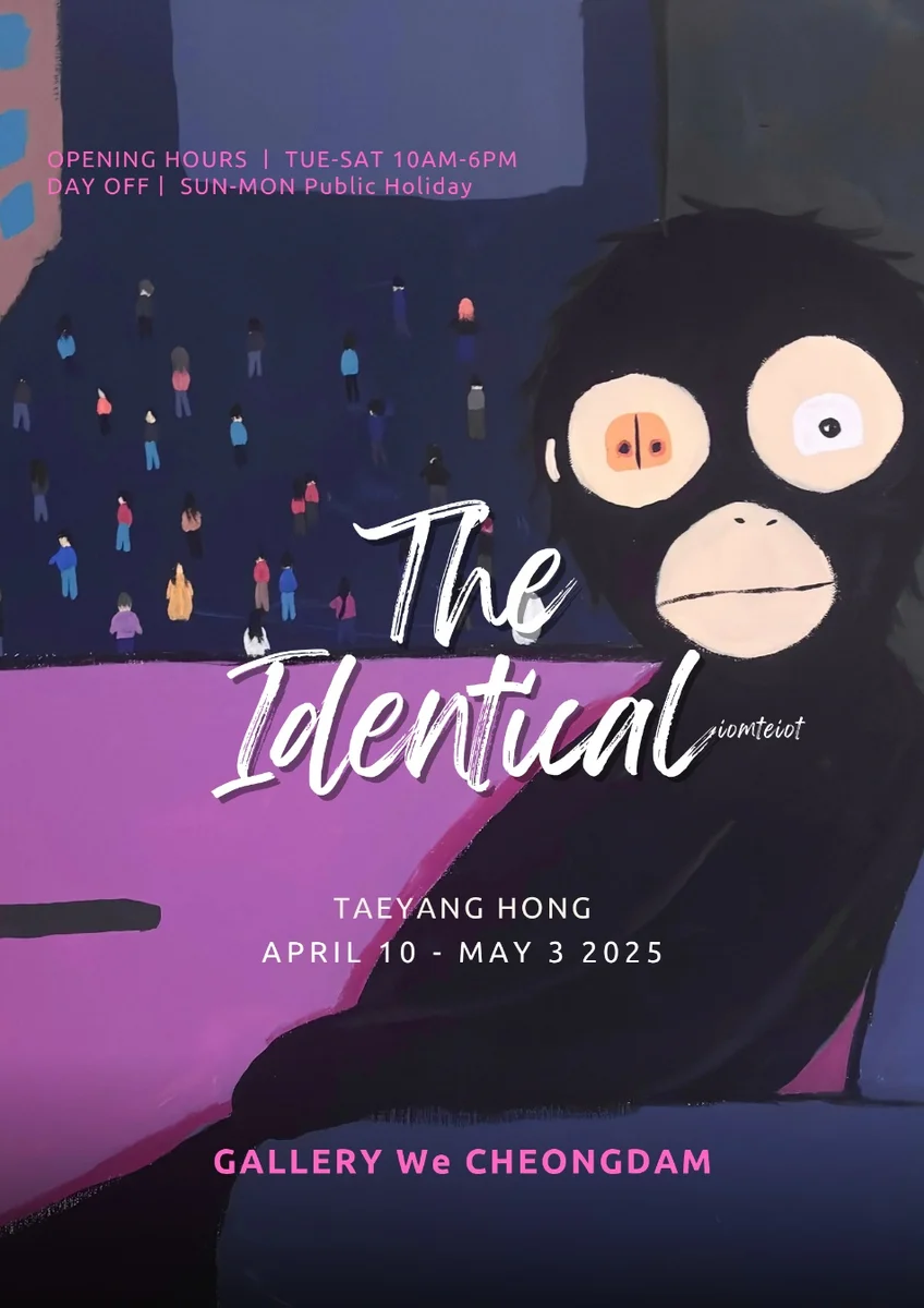 전시 개요 OVERVIEW THE IDENTICAL – 타인을 통해 나를 마주하는 시선의 구조 우리는 종종 타인을 통해 자신을 인식한다. 누군가의 말, 표정, 시선, 혹은 낯선 얼굴 속에서 문득 나와 마주치는 순간. 홍태양 작가의 《THE IDENTICAL》은 바로 그 지점에서 출발한다. 이번 전시의 중심에는 작가가 오랜 시간 구상해온 상징적 존재, 이옴테이오(IOMTEIOT)가 있다. Toi et moi(너와 나)를 거꾸로 배열한 이 이름은 단순한 언어 유희를 넘어, 타자와의 관계를 통해 정체성이 형성되는 아이러니한 구조를 드러낸다. 이옴테이오의 눈은 단지 대상을 ‘보는’ 수단이 아니다. 그 눈은 자아와 타자, 내면과 외부 세계를 연결하는 감각의 통로이다. 관객은 이 시선을 따라 타인을 바라보며, 어느 순간 자신을 응시하게 된다. 전시 속 회화와 드로잉들은 이옴테이오의 세계를 확장하며, 단일하고 고정된 자아가 아닌, 끊임없이 흔들리고 반사되는 존재로서의 정체성을 시각화한다. 익숙한 형상 속에서 어긋나는 감각은, ‘같음’과 ‘다름’의 경계, ‘자기’와 ‘타자’의 차이를 조용히 되묻는다. 《THE IDENTICAL》은 타인의 얼굴에서 나를 발견하는 전시이다. 그 낯선 눈빛 속에서, 우리는 스스로도 알지 못했던 자신만의 이옴테이오와 마주치게 될지도 모른다.
