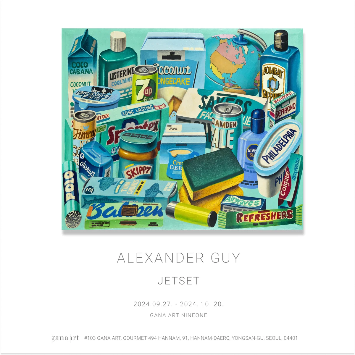 전시 개요 OVERVIEW 가나아트는 스코틀랜드 글래스고에서 활동하고 있는 작가 알렉산더 가이(b.1962)의 국내 첫 번째 개인전 “JETSET”을 개최한다. 가이는 일상 속 사람, 장소, 물건에 관심을 두고, 그가 스스로 ‘태키 리얼리즘(tacky realism)’이라고 명명한 작업을 통해 현대 사회에 만연한 문제에 대한 개인적인 통찰을 공유한다. 본 전시의 제목인 “JETSET”은 세계를 여행하며 삶을 즐기는 부유한 상류층이나 유명 인사를 의미한다. 가이는 SNS 시대에 사람들이 꾸며진 일상을 전시하며 인터넷상에서 가상의 유명인으로 변모해 가는 새로운 ‘JETSET’의 등장에 주목했다. 팬데믹 이후 변화한 소비주의, 급등한 물가, 과도한 포장재 사용 등 현대 사회의 불안과 긴장감을 그릴 위의 고기, 커피 자판기, 맥도날드 키오스크 등 작가가 지난 한 해를 살아가는 동안 마주친 일상적 요소를 상징적 매개체로 삼아 작품에 담아냈다. 매끄러운 표면과 강렬한 색채, 두텁게 발린 물감과 평면적이지만 디테일한 묘사, 강렬한 인공적인 색채가 돋보이는 가이의 작품은 작가가 살아가는 시대의 사회적 현상과 대중문화, 트렌드를 날것 그대로 작품에 담긴 일종의 타임캡슐 역할을 한다. 작가는 대형 캔버스에 단색의 배경 위로 빈틈없이 오브제를 배치하고 그려 내는 과정을 통해 마치 무대 위의 주인공에게 조명을 비추듯 극적인 효과를 주어 주목하게 한다. 이러한 구성을 통해 평범한 대상에 기존의 가치를 뛰어넘는 예술품으로서 새로운 가치를 부여함으로써 그 본질에 대해 사유하게 한다. 또한 작가는 일상속에서 발견되는 사물의 이면에 숨겨진 현대적 문제들을 그만의 화풍으로 유머러스하게 접근하며, 우리에게 주변에 대한 관심을 놓지 말아야 한다는 메시지를 전하고 있다.
