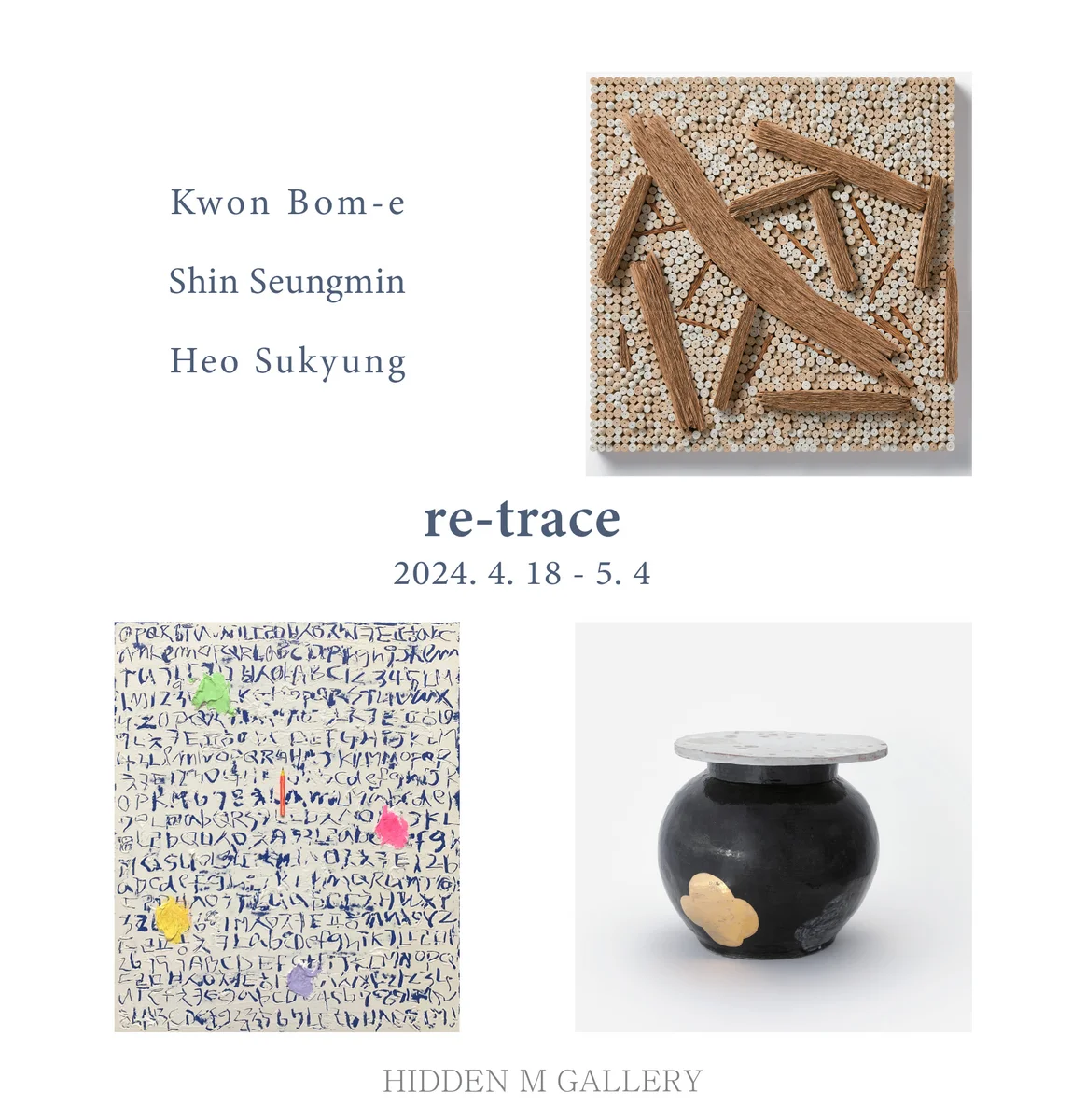 전시 개요 OVERVIEW re-trace | 권봄이, 신승민, 허수경 히든엠갤러리는 4월 18일부터 5월 4일까지 권봄이, 신승민, 허수경작가의 3인전 <re-trace>展을 개최한다. 권봄이작가는 반복적인 행위를 소외와 불안 속에서 오는 자기치유 방법 중 하나로써 습관에서 시작해 작업으로 연결한다. 작가는 순환에 세 가지 내용을 담아 작업으로 표현한다. 종이를 마는 행위적 순환, 종이를 말아 생기는 형태의 순환적 기호, 마지막은 전자적 인터페이스에 의해 사라져가는 물질적 재료를 이용하여 우리 삶에서 필수적인 재료의 인식을 넣어주는 종이의 자연적 회귀과정이라고 할 수 있다. 신승민작가는 유년 시절 기억에서 작품의 동기를 찾아 드로잉, 소품 및 오브제 등으로 조형화 한다. 작가의 작품에서 나타나는 이미지들은 주변 환경과 경험, 특정 사물 등 내적인 기억과 외부적인 영향으로 인해 구체적으로 형상화된다. 그의 기억은 이미 지나가버린 단순한 일회적 사건이나 닫혀 있고 고여 있는 경험이 아니며 여전히 미완성의 상태라고 할 수 있는데, 이는 현재의 삶과 상호 작용하면서 하나의 새로운 의미를 형성해 가는 역동성을 지니고 있다. 허수경작가는 절제된 감각 속에 은은하게 비추는 색감과 대비되는 거친 질감이 특징적이며, 작가가 살아온 인생의 감정과 시간의 흔적들을 형상화한 추상화 시리즈가 대표적이다. 그려진 부분을 지우려는 행위 속에 회화적 유희를 느끼고, 재료를 긁어내고 덧바르는 물리적인 힘을 가한 흔적들을 보여주는 작업을 진행해온 작가는 보는 이들로 하여금 또 다른 기억으로 자신의 삶을 되돌아보길 바라며, 인위적 행위를 배제한 표현을 통해 빡빡한 도시의 삶을 해소하고자 한다. 각기 다른 방법으로 지나간 시간을 복기하는 세 명의 작가들의 다양한 작품과 함께 본인만의 소중한 기억을 회고하는 시간이 되길 바란다.