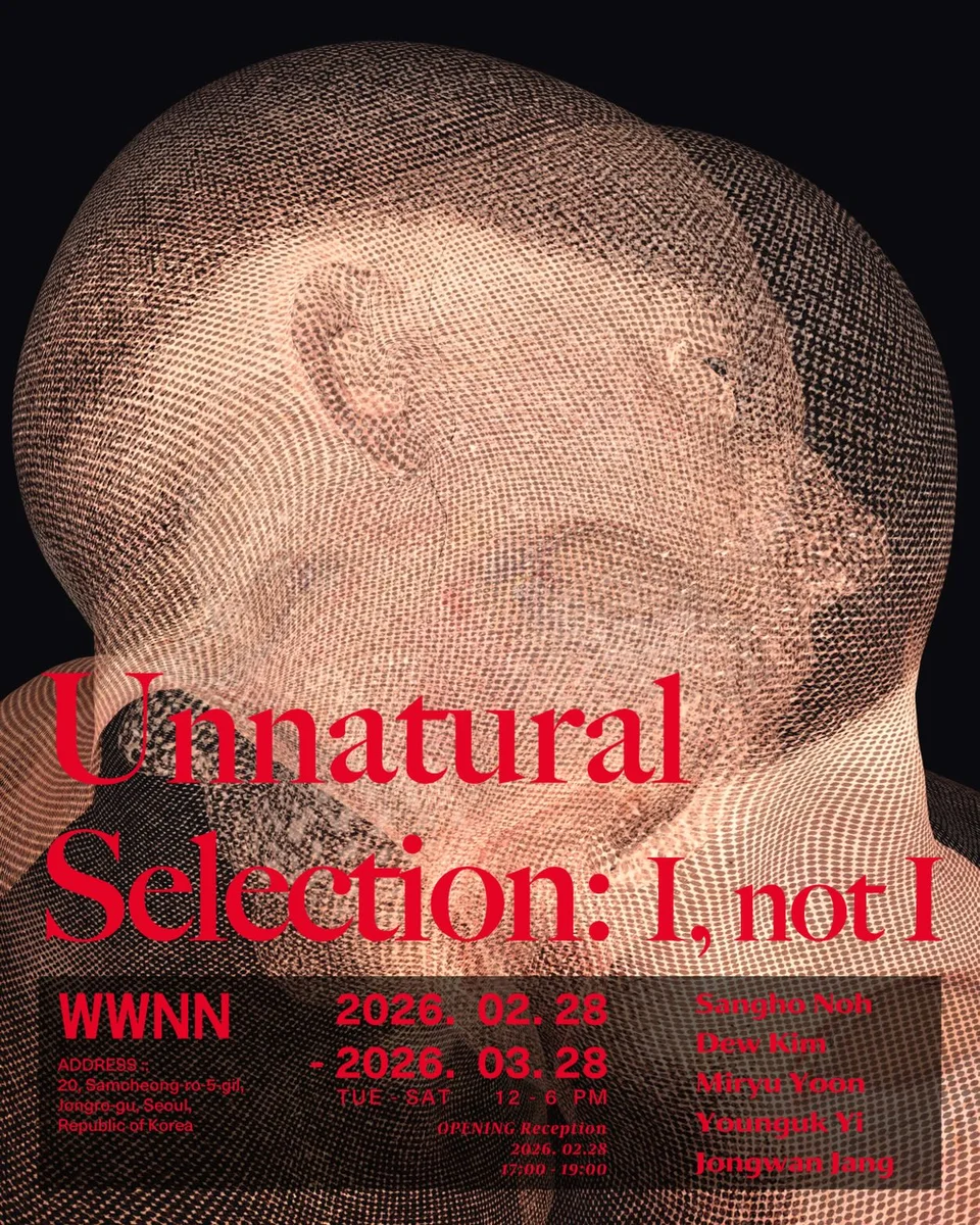 Unnatural Selection: I, not I 는 WWNN이 기획하여, 작년 일본 도쿄의 CON_에서 진행했던 순회 전시 프로젝트 시리즈로 도쿄에 이어 서울 WWNN에서 진행됩니다. 노상호, 듀킴, 윤미류, 이영욱, 장종완 다섯명이 참여하는 본 전시는 기술을 경계하거나 이상화하지 않습니다. 또한 더 나은 미래에 대한 낙관적 전망을 제시하지 않고, 우리가 살아가는 현재의 조건을 낯설게 바라볼 수 있는 감각을 환기시키며 “나는 어디까지 나로 남을 수 있는가”라는 질문을 던집니다. 참여작가: 노상호, 듀킴, 윤미류, 이영욱, 장종완 기획: WWNN 디자인: 백광인 출처: WWNN