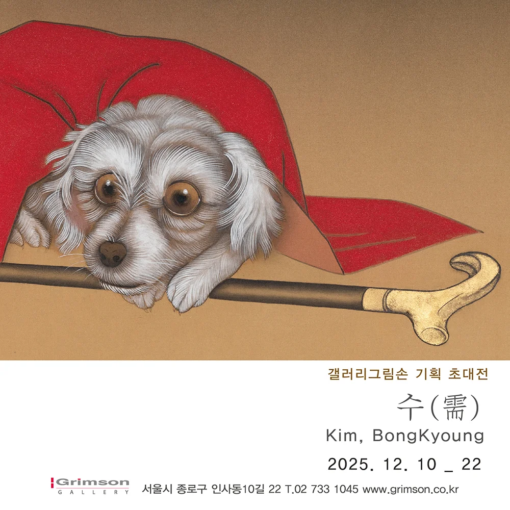 전시 개요 OVERVIEW 2015년 갤러리그림손 신진작가 선정 이후 10년 만에 개인전을 여는 이번 전시에서 김봉경 작가는 그동안 그려온 다양한 동물들과 자화상을 선보인다. 반려견을 비롯해 고래, 용, 고슴도치, 황소, 곰 등의 동물들은 작가의 내면에서 말하고 싶은 내용을 우의적으로 전달한다. 작품 속 동물들은 수묵화와 채색화의 경계를 넘나들고 있으며, 용기와 기백을 담은 동물들은 수묵의 발묵과 필묵의 거친 붓질로 표현되었고, 추억·흔적·어머니의 마음을 담은 동물들은 섬세한 채색으로 그려졌다. 작가는 하나의 동양화법에 머무르지 않고 전통 동양화의 다양한 기법을 주제와 의미에 맞게 적절하게 구성하며, 동양화의 정신인 사의성(寫意性)을 충실히 담아냈다. 오늘날 많은 젊은 동양화 작가들이 전통에서 벗어나 새로운 시도와 변화를 추구하며 현대미술의 맥락에서 작업하고 있다. 그러나 김봉경 작가는 변화하는 환경 속에서도 비단 위의 수묵과 채색이라는 전통적 형식을 고수하며, 젊은 작가로서 전통 회화를 이어야 한다는 소명까지 함께 지니고 있다. 이번 개인전의 제목 ‘수(需)’는 주역(周易)에서 비롯된 개념으로, 때가 이르지 않았을 때 성급히 움직이지 말고 내적 준비와 자기 수련을 다하며 자연의 순리를 믿고 기다리라는 뜻을 지닌다. 이는 작가가 이번 전시에 담아내고자 하는 의미를 정확하게 보여준다. 삶이 뜻대로 흘러가지 않거나 예기치 않은 변화가 찾아올 때, 작가는 작품을 통해 어떻게 나아가야 하는지 스스로에게 묻는다. 그의 작업은 일종의 자기 성찰이며 ‘기다림의 미학’이다. 김봉경 작가는 앞으로도 수많은 새로운 도전에 나설 수 있는 젊은 작가이다. 빠르게 변화하는 현대미술의 흐름 속에서도 지켜야 할 본질과 근본을 꾸준히 탐구한다면, 그는 자신이 원하는 방향으로 자연스럽게 나아갈 것이다. 이번 전시 이후 그는 새로운 작업 구상을 준비하고 있다고 말한다. 이번 개인전은 작가가 온전히 자신의 시간을 기다리는 장이며, 그 기다림의 끝에서 어떤 새로운 여정이 펼쳐질지 기대하게 만든다.