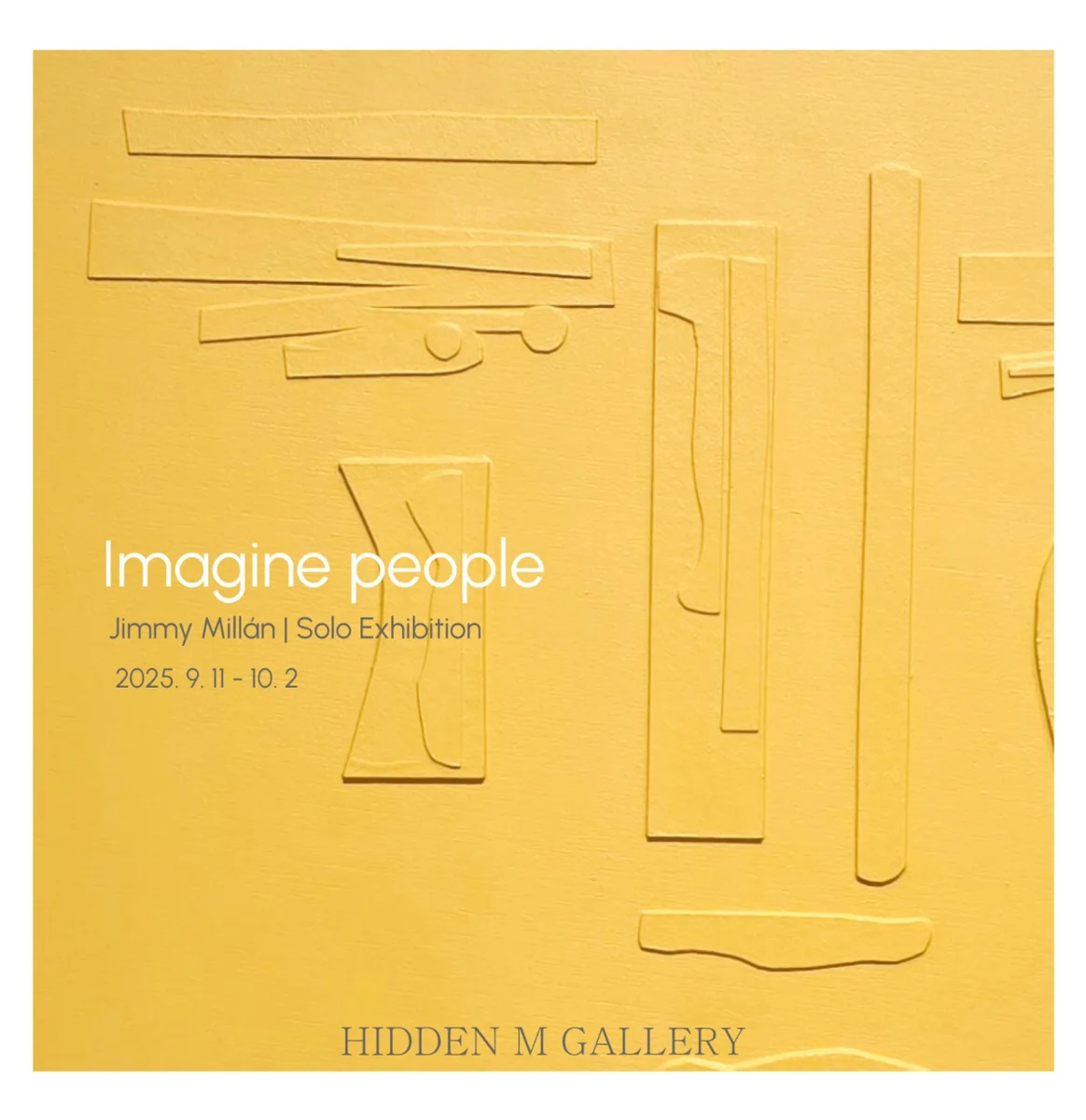 전시 개요 OVERVIEW 히든엠갤러리는 오는 9월 11일부터 10월 2일까지 Jimmy Millán(지미밀란)의 <Imagine people>를 개최한다. 이번 개인전에서 Jimmy Millán(지미밀란)의 상상력과 시선을 담은 30여점의 신작들을 선보인다. 지미밀란은 다양한 재료를 활용하여 섬세한 작업을 선보이며 평면적 모양과 색상뿐 아니라 입체적 질감으로 자신의 아이디어를 표현한다. 그는 자신만의 호기심과 영혼을 작품에 담기 위해 콜라주, 아크릴, 유화 등 다양한 혼합 매체 기법들을 사용한다. 지미 밀란의 얼굴 초상은 개개인의 영혼을 담고 있으며 또한, 복잡한 현실 사회의 단면도 담고 있다. 세상의 모든 사람이 가지고 있는 ‘독특함’처럼 각자의 ‘얼굴’은 구체적이고 객관화된 초상이 아닐 것이다. 그 ‘얼굴’은 그들 각자의 감정, 정신, 기분 상태에 대한 주체성의 반영이자 다른 면에서는 우리 사회가 요구하는 인간상에 대한 이상적 해석이다. 또한 그의 작품안에 주된 특징 중 하나는 붉은 점 (The red dot)에 대한 맹목적 집착이다. 초상화 작업에 항상 등장하는 붉은 점은 그의 작업을 감응하고 해석하는 필수적 사고의 창으로 여겨진다. 그 점은 우리가 삶을 살아가는 하나의 상징으로써 작가에 의해 반영되어 진다. 그가 보여주고자 하는 자유로움, 에너지 그리고 정서를 통해 각기 다른 새로운 상상을 만들어낸다. “얼굴은 끝없는 영감의 원천이자, 매혹과 감탄의 대상이다. 겉으로 드러난 모습은 각자를 구별 짓지만, 그보다 더 매혹적인 것은 얼굴이 은근하게 드러내는 내면의 감정, 생각, 욕망이다. 나의 초상화는 단순히 외형을 기록하는 것이 아니라 분위기, 태도, 아우라, 그리고 영혼까지 담아내려는 시도이다.” -작가노트 중 얼굴은 우리가 가장 먼저 마주하는 또 하나의 언어이자, 상상의 근원이다. 사람마다 다른 표정과 흔적은 각자의 개성을 드러내고, 우리 모두가 고유한 존재임을 보여준다. 작가는 단순히 겉모습이 아닌 그 너머에 담긴 감정과 생각, 태도와 기운에 주목한다. 작가는 눈앞의 인물이 단순한 그림이 아니라 실제 존재라면 어떠할지, 선과 색채 속에서 다른 누군가의 모습이나 자기 자신의 흔적을 발견할 수 있을지 상상해 보기를 제안한다. 이번 개인전에서 선보이는 초상화들은 관람자에게도 질문을 던진다. 작가는 관람자가 작품과 마주하는 순간이 단순한 감상을 넘어서는 경험이 되기를 바란다. 관람자의 감정과 시선이 그림에 스며드는 순간, 초상은 살아 숨쉬며 인간적인 울림을 전한다.