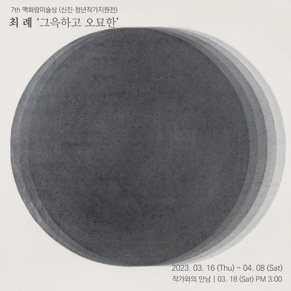 전시 개요 OVERVIEW 맥화랑은 젊은 작가들의 지속적인 작업 활동을 지원하기 위한 일환으로 이란 타이틀로 역량있는 젊은 작가들의 전시를 이어왔습니다. 2013년 이두원 작가, 2014년 조각의 유은석, 김현엽 작가, 2022년 김현수 작가 등 을 통해 전시가 이루어졌던 청년작가들은 현재 미술계에서 활발하게 활동을 이어가는 블루칩 작가로 성장했습니다. 올해로 일곱 번째를 맞이한 은 전통수성목판화 작업으로 인간 존재와 관계성에 대한 고민을 시각화하는 최례 작가를 수상자로 선정, 3월 16일(목)부터 4월 8일(토)까지 해운대 맥화랑에서 초대 개인전을 진행합니니다. 展을 통해 젊고 유능한 작가들이 미술시장에 소개되고 붓을 꺾지 않고 작업을 지속하며, 좋은 작가로 성장할 수 있도록 맥화랑이 작가들의 발돋움판이 되길 바랍니다. 최례 작가의 대표 작품은 공(空)시리즈로 공(空)은 원으로 표현됩니다. 원은 하나의 점에서 시작한 부드러운 곡선이 처음의 점까지 도착해 형태를 이루는 것으로, 모난 부분이 없이 완벽한 하나의 형태를 만들어 냅니다. 원은 그 자체로서 하나의 의미를 부여 할 수도 있고, 원과 원이 존재하는 화면 안에서, 화면이 존재하는 공간 안에서 다양하게 해석되어집니다. 원을 그리고, 만들고, 조각하고, 색을 올리고, 여백을 구성하고, 공간 안에 다시 배치하는 일련의 과정을 마쳐도 작품은 미완성입니다. 관객들과 원의 만남, 관객과 공간과의 만남이 작품의 나머지를 완성하는 것입니다. 작가는 원과 원의 관계, 원과 원의 사이와 경계, 이미지 표면과 그 너머의 이면 등에 대해 끊임없이 고민합니다. 작품 그 자체로서 보여지는 이미지, 그리고 그 이미지 너머에 존재하는 그 무엇에 관한 고민들. 이미지 자체는 단순하지만 그 이미지가 존재하는 다양한 화면과 공간 안에서 무수한 이미지와 감정을 상상할 수 있습니다. 하나의 원과 또 다른 원의 중첩, 혹은 원과 원의 닿을 듯 말듯한 경계 그리고 그 사이, 원과 원이 함께 있으므로 인해 파생되는 에너지 등에서 우리는 많은 것들을 생각할 수 있습니다. 최례 작가 작품의 주된 표현기법은 전통 수성목판화와 동양화 기법을 이용한 회화 작업입니다. 전통 수성 목판화 기법은 전통의 방법과 현대의 재료들을 함께 이용하여 작업합니다. 기계를 이용할 수 없고, 전 과정이 수공으로 진행되는데, 젖은 목판에 수성 안료를 올리고, 젖은 화선지를 올려 직접 바렌으로 문질러서 원하는 효과를 만들어 냅니다. 이 작업들은 딱딱한 목판 특유의 물질성을 가지면서도 동시에 동양화 같은 깊이 있고 부드러운 화면이 매력적입니다. 작가는 단순해 보이는 하나의 원을 만들기 위해 수십 번의 찍고, 말리기를 반복합니다. 이러한 반복의 과정속에서 층층이 쌓아 올려지는 색의 변화는 작가가 의도한 방향과 우연의 결합으로 풍부한 색의 질감을 만들어 냅니다. 목판에 균일하게 색을 올리고 찍어내는 과정은 은은하게 찍혀 나오는 나무의 결을 그대로 드러내는데, 이것은 직접적으로 색을 칠하는 것과는 전혀 다른 효과를 냅니다. 이런 화면의 효과들이 작가가 작품에 표현하고자 하는 일련의 관계성과 부합하고, 나아가 작업의 과정들은 숙련된 기술과 치밀한 계획, 그리고 오랜시간 공을 들여야 하는 작업인데, 작가의 성격이 일필휘지로 작업을 만들어내기 보다는 오랜 시간 숙고하고, 계획하고, 단계별로 진행시켜 나가는 것이 잘 맞기에 힘들지만 이러한 방법들로 작업을 하고 있습니다.