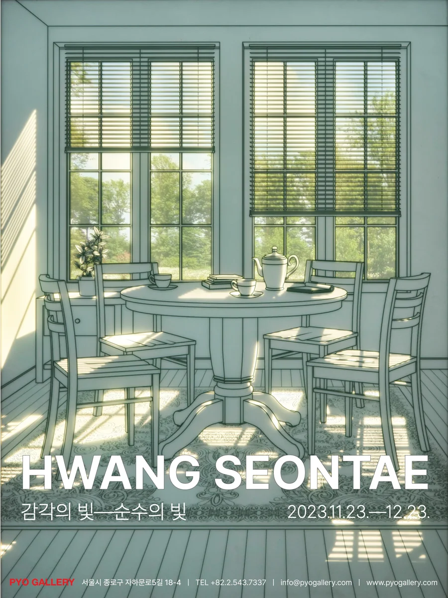전시 개요 OVERVIEW 표갤러리는 2023년 11월 23일 (목) – 2023년 12월 23일 (토) 황선태의 개인전 《감각의 빛ㅡ순수의 빛》을 개최한다. 황선태의 작품은 공간과 그곳에 스미는 특별한 빛, 마치 일상에서 놓치기 쉬운 듯한 미세한 빛의 아름다움을 전달한다. 이는 일반적인 감각을 넘어선 고요한 빛으로 우리가 일상에서 흔히 볼 수 있는 물체와 공간을 새롭게 느낄 수 있는 경험을 제공한다. 또한 그의 부피나 질감 없이 납작한 선만을 활용하여 사물과 공간을 표현하는 독창적인 작업방식은 국내외로부터 주목받아 독일 뢰벤호프 예술포럼 공모전 대상, 신세계미술제에서 대상, 국제로터리 클럽에서 유리미술공모전 특별상 등을 수상하였다. 작가의 작업에서 중요한 관점 중 하나는 사물의 존재함에 대한 이야기이다. 사물들을 희미하게 그리고 세부적인 특징을 생략하여 단순한 형태로 표현한다. 이렇게 함으로써 사물의 존재감이 두드러지게 강조되며, 사물이 단지 ‘그곳에 존재한다’는 느낌을 주는 작업을 한다. 그림 속의 사물들은 그렇게 놓여져 있고, 그들은 마치 독립적인 실체처럼 보인다. 그의 작품에 등장하는 불분명함을 통해 만져질 것 같은 물질적 덩어리로 표현되는 사물들과 공간은 관객에게 사색적인 경험을 제공한다. 또한, 의도된 생략과 강조를 통해 사물의 형태, 색상, 주변과의 관계, 역사 등의 세부적인 요소를 분석하여 한 가지 특징을 부각하고 나머지를 생략함으로써 사물을 새롭게 해석한다. 이 작업은 입체 작업이나 설치 작업을 통해 실행되며, 사물에 대한 다양한 관점을 탐구한다. 황선태의 작품은 사물에 대한 인간의 믿음에 대한 질문을 던지고, 사물을 독특한 시각으로 다루어 이성적이고 합리적인 판단을 넘어선 예술적 경험을 창조하는 데 중점을 둔다. 그의 작품엔 사물을 중심으로 한 작업을 통해 인간과 사물을 동등한 존재로 바라보려는 노력과 세계를 인간 중심이 아닌 더 폭넓은 시각으로 이해하려는 태도가 드러난다.