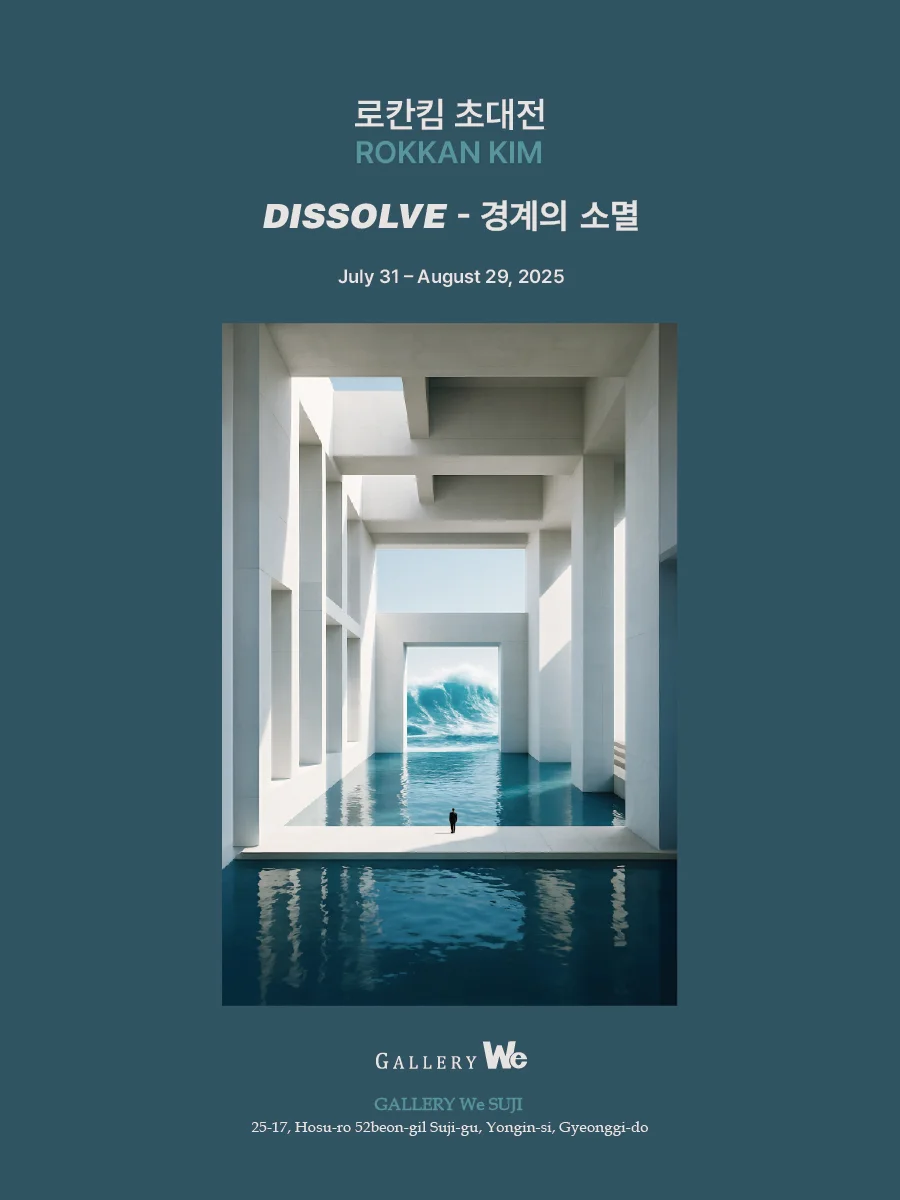 전시 개요 OVERVIEW 존재는 변화한다. 견고한 형태도, 멈춘 질서도 결국은 스러지고 흘러간다. 변화는 본질이며, 우리는 그 흐름 한가운데 있다. 갤러리위 수지의 로칸킴(Rokkan Kim) 초대전 ‘DISSOLVE – 경계의 소멸’은 시각적 대비와 긴장을 통해 해체되는 경계, 그 틈에 생성되는 새로운 감각을 응시한다. 로칸킴의 작업은 회화, 조형, 설치, 미디어아트를 아우른다. 작품의 형식을 넘어 작가가 견지하는 것은 흐름과 경계가 충돌하는 순간에 생성되는 긴장의 감각, 따라 포착되는 존재의 새로운 상태다. 고정과 유동, 인공과 자연, 억압과 자유의 이질적 만남과 교차를 통해 변화, 그리고 그 너머에 잠재한 의미를 탐색한다. 순백의 기하학적 아름다움을 지닌 거대한 건축이 있다. 완벽에 가까운 비례와 구조, 매끈하게 마감된 표면은 감정이 배제된 듯 견고하고 냉정한 질서를 뿜어낸다. 작품의 배경을 넘어 전체의 질서를 지배하는 조형적 주체다. 파도가 일렁이고 몰아친다. 유려한 물결은 그러나, 부드럽지만은 않다. 경계를 침범하고, 구조와 충돌한다. 파도는 감정의 움직임, 기억의 중첩이며, 끊임없는 존재의 증명이다. 충돌은 통제를 흔들고, 멈추지 않는다. 이제 구조는 안과 밖을 나누는 경계이자, 시선을 통과시키는 창, 해체적 흐름이 파고들 균열의 징후가 된다. 거대한 충돌 앞에 인물이 있다. 구체적 표정도, 동작도 없다. 이 말없는 익명이 서 있는 곳이 우리의 자리다. 그 자리에 섰고, 거대한 구조를, 극적인 대립을, 그리고 다가올 균열의 예감을 숨죽인 채 마주한다. 변화 앞의 우리는 무엇을 생각할까. 이번 초대전에는 정제된 구획과 절제된 색면으로 구성된 회화 작업과 수직적 분할의 구조와 유동적 영상이 병치된 미디어 작업이 함께 전시된다. 응축된 회화와 변화하는 영상의 중첩은 정지와 흐름, 구조와 파동의 긴장을 더욱 선명히 드러낸다. 로칸킴이 구축한 디졸브(DISSOLVE)의 세계 속에서 물리적 형태의 경계를 지우며 도달할 새로운 상태의 사유를 감각하기 바란다.