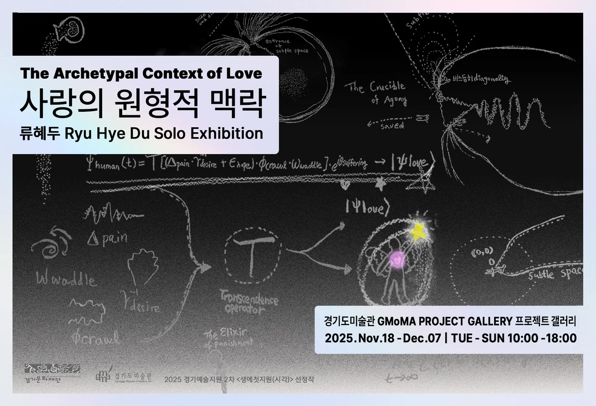 2025 경기예술지원 2차 공모 생애첫예술활동지원 시각예술분야 선정작가 전시 사랑의 원형적 맥락 2025. 11. 18. ~ 2025. 12. 07. 경기도미술관 1층 프로젝트갤러리 "사랑은 분명 찬란한 영역에서 행복의 극치를 담고 있지만, 인간을 구원하는 사랑의 속성은, 인간이 닿을 수 없는, 알지 못하는 영역의 사랑이다. 온전히 나체로 사랑 앞에 무릎 꿇고 그 통로를 지나는 과정에서 마주하는 낯설고 서슬 퍼런 파괴적인 어둠의 아름다움이다. 반대의 영역, 뒤집힌 영역... 그곳의 사랑." (『사랑의 원형적 맥락』소론집 발췌) 류혜두는 설명할 수 없는 것을 사유하려는 갈망에서 출발해, 그 사유의 과정을 역설적인 준물리 공식과 시각적 언어를 통해, 칠판 연구 드로잉, 영상 그래프, 도해 작업으로 구현한다. 이번 전시 《사랑의 원형적 맥락》은 단순한 감정을 넘어 인간의 존재를 변화시키며, 내면을 깨우는 숨결인 ‘사랑’의 본질을 비추고, 인간을 무너뜨리면서 동시에 구원하는 사랑의 이율배반적 힘 앞에서 삶의 원리를 해석하고 순수한 답을 찾고자 하는 모습을 그린 전시이다. *류혜두는 2025년 경기예술지원 2차 공모 생애첫예술활동지원 시각예술분야에 선정되었다. 올해 신설된 ‘공간지정지원 트랙’은 실험적이고 동시대적인 예술 언어를 탐색하는 신진작가를 발굴·조명하는 프로젝트다. 장소 경기도미술관 1층 프로젝트갤러리 참여작가 류혜두 주최·주관 경기도, 경기문화재단