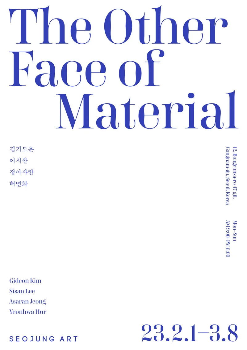 전시 개요 OVERVIEW 서정아트는 《The other Face of Material》展을 개최하며 김기드온, 이시산, 정아사란, 허연화 작가의 작업을 선보인다. 이번 전시는 사물과 현상을 이분법적으로 구분할 수 없음에 집중하여, 사물과 현상의 경계와 이면을 탐색하는 작가 4 명의 작업들을 소개하기 위하여 기획되었다. 김기드온 작가는 조형원리의 기본을 이루는 점, 선, 면을 와이어 매시와 로프를 통해 시리즈 조형 작품을 만든다. 단순함의 미학을 구현하는 김기드온 작가의 조형 작품 시리즈는 규칙적인 패턴을 형성하여 견고한 실루엣과 세련된 조형미를 보여준다. 오브제, 가구 그리고 공간 작업을 이어가고 있는 이시산 작가는 자연과 인공물, 인간 사이의 관계에 대해 탐구하며, 소재가 가진 순수한 본질을 바탕으로 정제된 언어의 형태로 작업을 하고 있다. 이시산 작가의 작품에서 주요 소재는 돌과 스테인리스 스틸이다. 자연물인 돌이 지닌 개별성과 인공적 재료인 스테인리스 스틸이 함축하는 인위적인 면은 두 물질의 공생을 통해 드러나며 이 둘 사이를 잇는 긴장감도 함께 전해진다. 정아사란 작가는 현실과 가상세계, 그리고 그 사이를 부유하는 비가시적인 데이터를 수많은 레이어를 통해 구현한다. 정아사란 작가에게 디지털 데이터는 더 이상 가상의 좌표값이 아닌 투명한 환각과도 같은 잔존물이다. 작가는 유동적인 디지털 데이터를 흐르는 액체처럼 표현하며 디지털 데이터들의 여정을 보여준다. 허연화 작가는 다양한 형태의 조각물과 실크스크린 그리고 페인팅 등을 통해 물의 유동적인 속성을 자신의 작업에 접목시킨다. 작가는 물과 관련된 풍경들을 작업해오며 인체가 빈번하게 체감하는 일상적인 공감각에서 벗어나는 감각들을 찾아내고, 각기 다른 성질의 액체들이 자연스럽게 섞이듯 관련 없어 보이는 사물과 사건들에 이야기를 부여한다. 이로써 연결되는 상황을 작업에 구현하며 구획된 공간에서의 탈피를 시도한다. 《The other Face of Material》은 단순하게 정의되는 ‘물질’의 고정된 의미에서 벗어나, 드러나지 않은 물질의 숨은 의미를 찾아가는 여정을 탐구하는 전시이다. 이번 전시를 통해 김기드온, 이시산, 정아사란, 허연화 4 명의 작가가 만든 물질의 여정에 함께하길 기대한다.