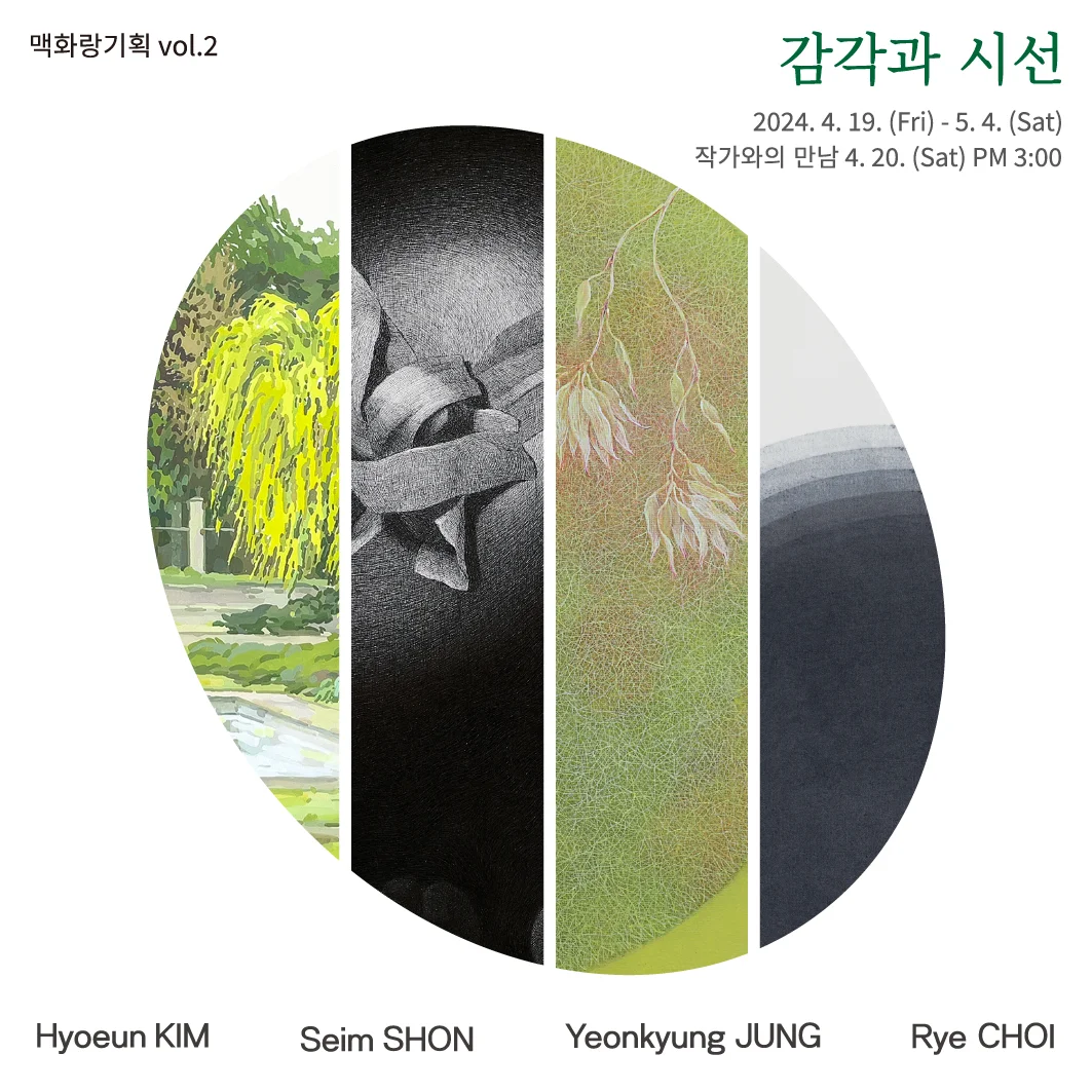 전시 개요 OVERVIEW 맥화랑은 2022년 기획했던 《감각과 시선》에 이어 2024년 올해도 여성 작가 단체전으로 vol.2 《감각과 시선》을 진행한다. ‘여성 작가 단체전’라는 용어는 단순히 ‘성별’의 구분이라기 보다 사회적으로 구축된 역할, 행동, 기대, 식별 등 집합적인 개념을 지칭하는 ‘젠더’로서 그들이 ‘감각’하는 세계와 ‘시선’에 대한 이야기를 하고자 함이다. 개인의 성격이나 경험, 환경적 요인의 차이로 인해 일반화할 수는 없지만, ‘여성’으로서의 사회적 역할과 문화적 기대는 분명 존재한다. 다만 이런한 젠더 역할이 ‘작가’라는 역할 속에서 작업으로 이어질 경우 작품은 어떤 양상을 띄게 될까. ‘작가’로서 역할에 젠더적 기대나 제한이 존재할 수 있을까. 맥화랑 기획전 《감각과 시선》은 이러한 질문에서부터 출발한 전시이다. ⠀ ‘감각’과 ‘시선’은 우리가 세상을 이해하고 경험하는데 중요한 개념이다. ‘감각’은 우리의 인식 기능으로, 외부의 자극을 인지하고 처리하는 능력을 의미한다. 사람과 세계의 접촉은 오감이라고 일컫는 ‘감각’에서부터 시작된다. 우리는 감각기관이 받아들인 정보를 통해 세상을 인식하고 경험하게 된다. ‘시선’은 우리가 세계를 바라보는 관점이나 시각을 나타낸다. 이것은 개인의 경험이나 가치관, 문화적 배경 등에 의해 영향을 받는다. 우리가 사물이나 사람, 상황 등을 인식하고 해석하는 방식을 결정짓는 중요한 요소이다. 또한 ‘시선’은 우리의 주의나 관심을 특정 대상에 집중시키는 역할을 하기도 한다. ⠀ 동시대를 살아가고 있는 김효은, 손세임, 정연경, 최례 작가가 ‘감각’한 세상은 어떤 모습일까. 각기 다른 네 명의 ‘시선’ 끝에는 무엇이 놓여 있을까. 4월 20일 오후 3시 진행될 작가와의 만남을 통해 ‘작가’로서 감각한 세계와 시선, ‘여성’으로서 감각한 세계와 시선의 차이에 대해 이야기 나누며 우리가 세상을 이해하고 탐구하는 데 있어 상호 보완적이고 연결된 개념인 ‘감각’과 ‘시선’을 통해 그들이 선보이는 삶의 궤적을 따라 가보고자 한다. 맥화랑 큐레이터 김정원