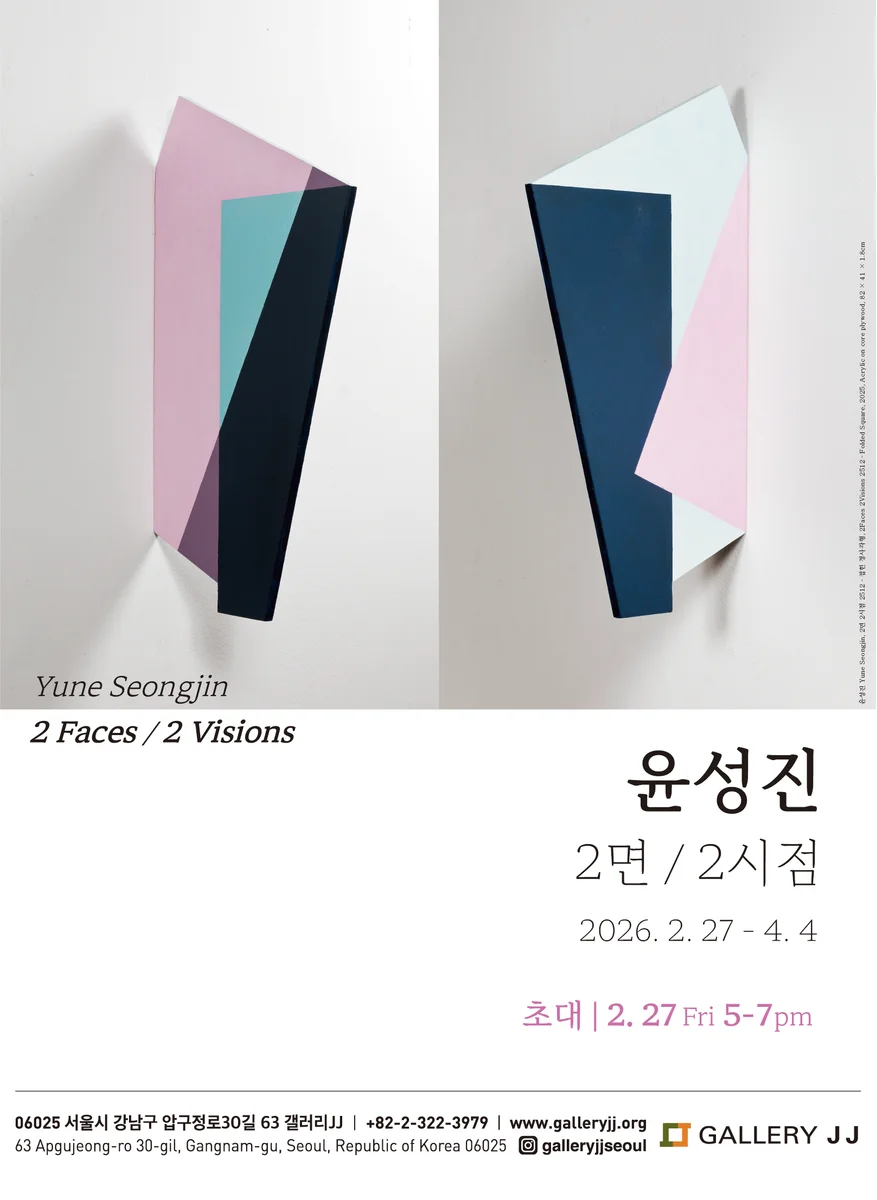 “조각의 ‘평면적 기억’, 회화의 ‘확장된 공간 기억’이 결합될 때, 미술 표현의 또 다른 가능성이 열린다.” ㅡ윤성진, 작가노트 2025 오늘날 조각은 소재나 표현 기법에 있어서 회화, 설치미술, 퍼포먼스, 영상 등과 혼성적 양식으로 나타나고 이러한 타 장르와의 결합을 통해 공간과 개념을 확장하고 있다. 갤러리JJ는 조각가 윤성진의 개인전 <윤성진: 2면 2시점>을 마련하였다. 윤성진은 회화와 조각을 넘어선 공간을 모색하고 동시대 조각의 새로운 경험을 탐색한다. 작가는 전통 조각의 물성과 양감을 최소화하여 회화적 평면을 지향하는 역설적인 접근방식으로, 회화적 평면의 양면을 가지는 추상적 오브제인 ‘2면 조각 (2-face sculpture)’을 제시한다. 그것은 조각 구조에 회화적 경험을 결합하는 것으로 나타난다. 이번 전시는 작가가 파리에서의 오랜 생활을 마치고 서울로 돌아온 이후 지난 4년간의 작업들을 모아 최초로 선보이는 자리로, <접힌 사각형> 등 신작을 비롯하여 그의 작업의 대표적인 ‘2면 조각’들을 소개한다. 전시는 20여점의 공간에 세우는 스탠딩 작업과 벽면을 이용하는 벽 작업으로 구성된다. 이번 전시는 그 동안 그가 사유하고 구축해온 특유의 조형 방식과 관람객의 시지각적 경험을 기반으로 하는 작품세계의 독자성을 조명한다. 윤성진의 추상조각은 기하학적 조형요소 및 서예에서 비롯된 원리와 조형적 감각을 바탕으로, 회화의 평면성과 조각의 구조가 만나는 지점을 탐구하며 현대조각의 경계를 확장해왔다. 회화와 표현의 경계가 맞물리는 조형 구조를 가진 그의 작업은 조각이 점유해 온 물리적 공간을 넘어 평면 내부에서 발생하는 공간적 긴장과 감각의 층위를 섬세하게 드러냄으로써 평면과 입체에 대한 질문을 던진다. 작가가 ‘회화적 조각’ 혹은 ‘2면 조각’이라 명명하는 작업은 기하학적 추상 구조를 기반으로 하며, 회화와 조각, 설치라는 장르의 경계를 오간다. 하나의 얇은 판 위에 서로 다른 두 회화적 면을 병치하는 방식은 평면과 입체 사이의 긴장을 형성하며, 관람자의 이동과 시선의 변화 속에서 작품이 점진적으로 완성되도록 유도한다. 이로써 작업은 앞과 뒤, 내부와 외부라는 이분법적 구분을 넘어, 두 면 사이에서 분위기가 교차하는 또 다른 감각적 공간을 생성한다. 돌이켜보면, 과거에도 예술 형식들은 서로 완전히 닫혀지지 않았다. 오랜 서양 조각의 역사에서 조각은 건축, 회화와 분리되지 않고 상호 작용했으며, 르네상스 이후 이들은 독립하여 자율적 형식을 갖추게 되었고 시간이 지남에 따라 형식 간의 경쟁이 스스로에게 집중하고 강력한 방식임을 입증하는 식으로 진전되었을 뿐이다. 현대미술에 이르러 새로운 소재로 질량을 최소화하고 내외부를 연결하여 전통적 조각의 틀에서 벗어나고자 했던 나움 가보(Naum Gabo), 사진이라는 매체를 조각으로 끌어들여 조각의 커다란 화두인 평면과 입체에 대한 질문을 던지는 권오상 등 조각의 정체성은 끊임없이 도전 받아왔다. 지난 1990년대 초 작가는 과학의 발달로 인한 가치관의 변화와 혼돈의 시대를 표현하고 자연파괴와 인간성의 피폐함을 고발하는 등 표현성이 짙은 작업으로 잘 알려져 있다. 은빛 알루미늄판을 자르고 조합하는 등 1970년대 한국미술의 물성 탐구의 계보를 잇는 작업을 하였고, 그의 작업들은 국립현대미술관을 비롯하여 시립미술관 등 국내외 주요기관에 소장되어 있다. 주관적인 감성과 물성을 중시하는 표현주의적 작업은 어느덧 변화하여 현재의 균형과 이성 중심의 기하학적 추상 형태에 이르게 되었고, 이에 대한 궁금증을 불러일으킨다. 그것은 20여년 가까운 파리 생활에서 몸에 배인 문화적 분위기와 십자가 형태의 조형작업과의 연관관계, 러시아 구성주의를 비롯한 20세기 초 미술사를 숙고하여 차용하게 된 점, 그리고 무엇보다 작가 자신의 깊숙한 내부로부터 대면한 서예의 조형성에 대한 기억에서 그 이유를 찾을 수 있을 것 같다. — 선, 면, 공간 전시장에 벽과 바닥에 설치된 기하학적 추상 오브제들은 선과 면이라는 조형의 기본 요소들이 평면의 내부는 물론 조각의 구조적 형태로서 연속적으로 펼쳐진다. 절제된 단순한 색채 사용은 형태의 구조적 특징을 강화한다. 작품들은 내부에 뚫린 구멍으로 인해 작품의 내부와 외부의 구별 없이 공간이 연결된 형태이거나 혹은 대부분이 서로 유기적으로 연결된 사각형이나 원들이 반복하고 증식하며 공간 속으로 확장되는 듯하다. 작품은 개별요소보다 전체의 구조적 맥락 속에서 파악된다. 윤성진의 조형 세계를 내부적으로 들여다보면, 동양 전통의 수묵과 서예에서 비롯된 획의 조형적 감각과 선(linear)적 행위를 공간으로 끌어내며, 구조주의적 사고와 함께 현대미술사의 차용과 변용으로 과거 역사를 참조한다. 작가는 조각에서 ‘매스를 축소하려’고 지속적으로 고민해왔으며, 서예에서의 필묵과 여백이 만들어내는 내외부공간의 긴장 관계에 주목하여 조각적 구조로 확장한다. 즉, 획의 역동성은 평면에 머무르지 않고 그것이 가로지르는 공간을 점유하며, 작가는 이러한 붓과 종이 사이에서 발생하는 긴장감과