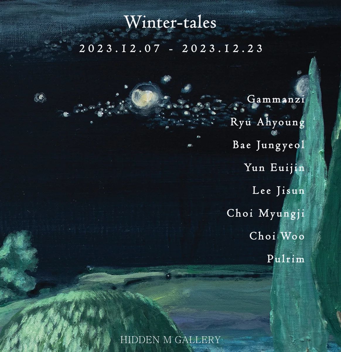 전시 개요 OVERVIEW 2023. 12. 7 – 2023. 12. 23 히든엠갤러리는 12월 7일부터 12월 23일까지 감만지, 류아영, 배중열, 이지선, 최명지, 최우, 윤의진, 풀림작가의 <Winter-tales> 그룹전을 개최한다. 감만지작가는 삶 속에서 일어나는 다양한 생각과 사건들 중 한 순간을 포착하고 단순히 인물을 그리는 것이 아니라 인물이 처한 상태의 개념이나 감정을 시각화 한다. 작가의 그림은 인간의 삶 자체에 대한 이야기이거나 상태에 대한 감정을 통해 이 세상을 살아가는 이들이 간직해야할 것들, 소규모 공동체의 중요성을 증명해내는 그림이기도 하다. 또한 작품 속 이미지들은 작가의 어린시절의 경험이나 기억을 토대로 상상하며 재현하였다. 작품 속 주된 재료인 먹으로 작가의 감정을 종이 위에 농도 깊은 먹으로 표현하고 있다. 붓에 묻은 먹의 농도와 필력의 속도에 따라 나타나는 우연적 효과는 작가가 삶 속에서 기억하고 경험한 감정을 표현하며 그림 곳곳이 번져 하나의 노이지(noise)를 만들어낸다. 작가의 이런 즉흥적이고 우연적인 재료와 기법은 호소력 있는 표현을 가능하게 한다. 류아영작가는 자연과 인간의 공존을 마치 동화 속의 한 장면 같은 이야기로 풀어간다. 작품으로써 누구나 순수했고 무한했던 상상력과 꿈이 있는 어린아이였음을 다시금 기억할 수 있도록 한다. 작가가 생각하는 가장 이상적인 공간인 숲과 자연, 천진난만한 아이로 그려가는 다양한 에피소드로 인간의 꾸밈없이 순수한 내면의 성찰을 모색할 수 있도록 한다. 어른이 되어가는 과정 속에서 우리는 너무나 많은 것을 알아버렸고, 동시에 많은 것을 잊게 되었다. 작가는 작품을 감상하는 이들로 하여금 우리 안에서 잊혀지고 상실된 것들과 보이지 않던 심연의 깊은 곳들을 탐색하며 되찾는 시간이 되었으면 한다. 그것은 곧 우리의 내면 안에서 잊혀진 듯 보이지만 소중히 남겨져 있는 가장 꾸밈없이 순박했고 다정했던 순수함일 것이다. 배중열작가는 인간이 만들어 낸 건물과 구조물로 인해 사유화되어 점점 사라져가는 자연의 초록 풍경을 작품 속에 담아낸다. 당연하듯 여겼던 초록의 풍경들은 이제는 쉽게 만날 수 없는 특별한 공간이 되어버렸다. 작가는 이번 전시에서 ‘초록, 여유’를 주제로, 자연으로부터 영감 받은 색의 풍경으로 사람들로 하여금 초록의 소중함과 여유, 쉼을 선물하고자 한다. 윤의진작가는 자연이 내뿜는 생명력 가득한 숨을 맡고, 멀리서는 약속된 순환이 지켜지는 것을 바라보며 흘러가는 것들에 대해 지나치게 슬퍼하지 않는 법을 배우고 있다. 작가는 말하지 않는 것, 부지런히 계절의 시간을 만드는 것, 순리를 지키는 법, 그리고 우리의 기원이 되어주는 의지 같은 것들을 오래 배우고 지켜보았다. 작가는 자유롭게 여행하는 섬이 되기로 하였고, 그 섬에는 버드나무와 달을 싣고 어디로든 갈 수 있게 되었다. 다정하고 부드러운 줄기를 길게 늘어뜨린 버드나무는 외부로부터 방어하고 적당한 거리를 유지하게 한다. 그 안에서 작가는 풍성하고 아름답고 건강할 수 있게 부지런히 섬을 꾸린다. 곁을 떠나지 않는 달은 초월적 존재가 되어 신이 되고, 절대 버릴 수도 떠날 수도 없는 스스로가 된다. 어디에도 기댈 수 없는 캄캄한 밤 은은한 빛으로 소망이 되어주는 달처럼, 작가는 작가 자신을 위해 연약한 등을 켜고 또 다른 사람들을 위해서도 불을 켜는 그림이 되고 싶다고 한다. 이지선작가는 개인과 사회가 만든 기준에 부합하기 위해 억눌려왔던 내면세계를 회복하고자 한다. 작가는 그림을 그리다 보면 어느새 마음 깊은 골짜기까지 내려가 그 곳에 방치되어 온 내면세계를 만나곤 한다. 그 곳에는 구슬같이 반짝이는 유년기의 상상들이나 내면의 이야기들이 가득했지만, 개인과 사회가 만든 기준에 부합하기 위해 오랜 시간 억눌러 와야 했던 것들이었다고 한다. 캔버스 속의 거대한 숲에서 내면을 다시 발견해가는 과정을 아이들이 숲에서 비밀놀이를 하며 하나씩 꺼내어 보는 여정으로, 물 속에서 유영하듯이 이상적 세계를 향해 가고 있는 모습으로 담아내고 있다. 캔버스 속 숲의 이야기는 소외되었던 내면세