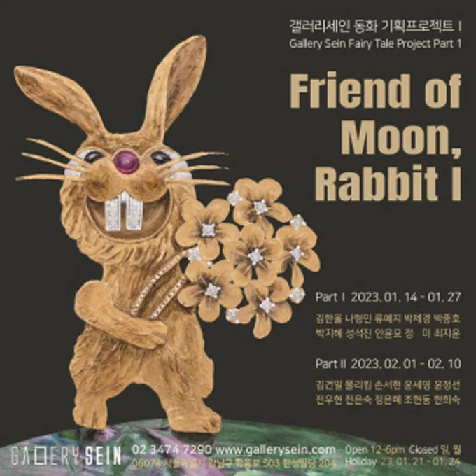전시 개요 OVERVIEW 갤러리세인은 동화 기획프로젝트를 시작한다. 동화와 동심을 주제로 다양한 작품들을 장기적으로 선보일 예정이다. 동화는 유아기부터 우리의 곁에서 세상을 인식하고, 삶을 살아가는 태도를 가르쳐주며 성장시켜 주었다. 또한 동화는 보편적인 시각이 아닌 무한한 상상력과 창의적인 발상으로 만들어 졌다. 이 지점에서 동화는 예술과 같은 맥락을 가진다. 예술작품으로 우리는 현재 세상을 다시금 바라보고 교훈을 얻기도 하며, 예술가들의 무궁무진한 실험정신을 엿볼 수 있기 때문이다. 이미 어른이 되어버린 우리가 동화를 통해 동심을 찾듯, 예술작품을 통해 동화에서 얻었던 동심과 교훈, 순수하고 투명한 상상력을 느껴 보는 전시 프로젝트가 될 것이다. 토끼해가 밝았다. 계묘년 (癸卯年)을 맞이하여 첫번째 프로젝트, ‘갤러리세인 동화 기획프로젝트Ⅰ 달 친구, 토끼’전 을 개최한다. 회화 부문에서는 안윤모, 최지윤, 정미, 박제경, 류예지, 박종호, 김한울, 박지혜, 몰리킴, 손서현, 전우현, 김건일, 조현동, 전은숙, 한희숙, 윤세영, 나형민, 입체 부문에서는 성석진, 정은혜, 윤정선 작가들의 작품을 선보인다. 우리는 수많은 토끼 이야기를 접해왔다. 전래동화에서 토끼는 꾀가 많고 재주가 많으며, 지혜로운 토끼로 그려진다. 토끼를 통해 우리는 삶을 배우고, 삶의 지혜를 배워왔다. 세계명작에서 토끼는 거북이와 경주하다 지고마는 어리석은 동물로, 이상한 나라의 앨리스에서는 앨리스를 이상한 나라로 이끄는 주요 캐릭터로 상상의 나래의 상징으로 등장한다. 예로부터 입에서 입으로 이어져온 토끼의 은유와 상징은 예술가들에게 다양한 의미로 사용되어 왔다. 대표적으로 요셉 보이스의 에서 토끼는 털갈이를 하며 변화하는 토끼를 예술가의 부활과 확산의 상징으로 연결시켰고, 백남준은 에서는 유머러스하고 상상의 원천으로 여겨진다. 이처럼 전위 예술가들에게도 토끼는 예술적 영감의 근원이자 소재였다. 달과 토끼는 어떤 관계를 갖는가?. 토끼가 달에서 떡방아를 찧고 있다는 이야기를 믿는 사람이 있을까? 우리는 그 상상만으로도 동심으로 돌아간다. 또한 달과 토끼와 같은 전래동화는 창의력이 강조되는 시대에 상상력을 기르며, 올바른 가치관, 그리고 따뜻한 마음을 가지게 한다. 성인이 된 지금, 전래동화를 읽는 사람은 극히 드물 것이다. 전래동화의 이와 같은 배려, 교훈, 따뜻한 이야기를 달과 토끼를 주제로 풀어낸 예술가들의 작품을 통해 전달하고자 한다. 검은토끼의 기운으로 새로운 해가 밝은 1월, 예술가들의 따뜻한 환상의 세계의 이미지를 통해 유년시절의 추억을 회상해볼 수 있을 것이다. 모두 동심으로 돌아가 새해에 새로운 다짐을 하듯 현 시대에 필요한 가치관을 다시 되새기고, 따뜻한 정서를 나눠볼 수 있기를 바란다.
