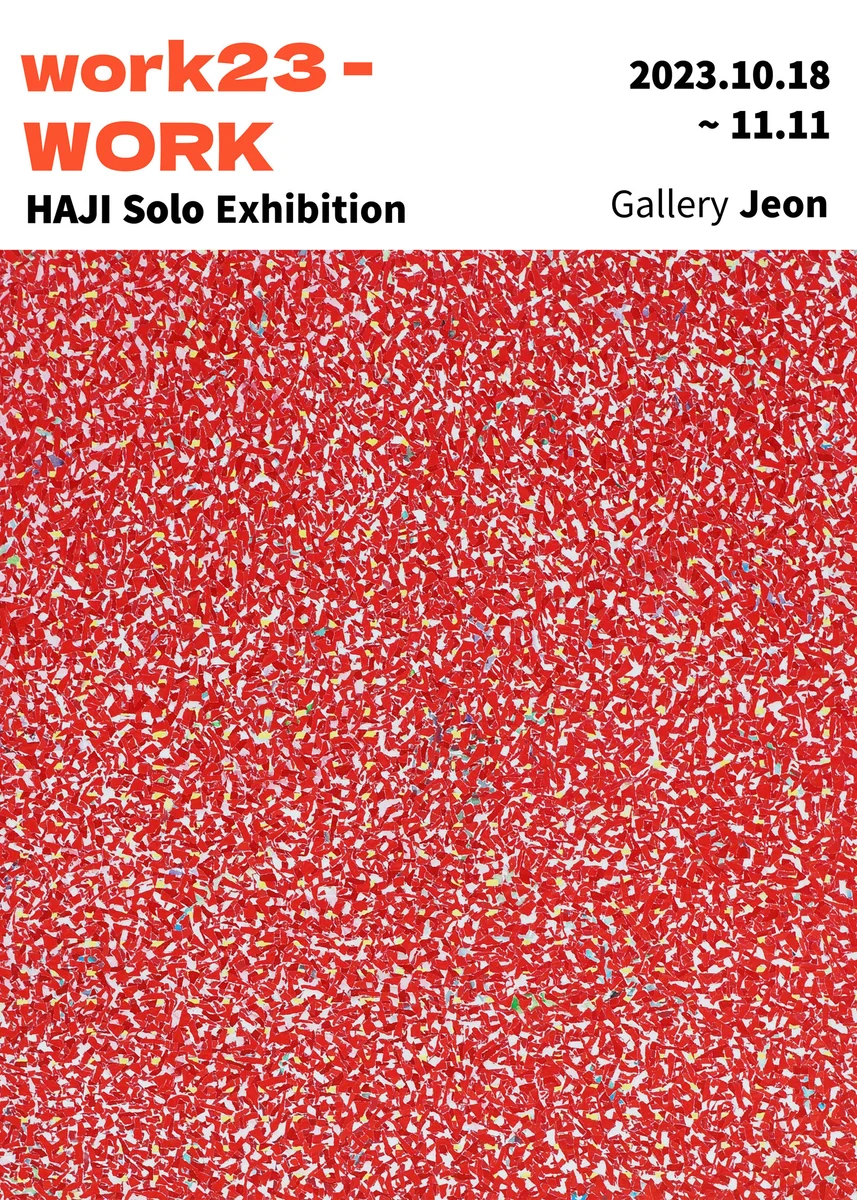 전시 개요 OVERVIEW ● 전시명 : work23-WORK ● 기 간 : 2023. 10.18(수) – 11.11(토) ● 시 간 : 10:00 – 18:00 (일/월 휴관) ● 장 소 : 갤러리 전 A/B관 (대구 수성구 달구벌대로 2811 2F) 주로 설치미술과 평면작업을 하는 하지 작가는 붙이고 떼어내는 기법을 통해 작품 속 연속적 행위와 인과관계의 상반된 의미를 하나로 이어주고자 한다. 이번에 전시될 작품은 ‘WORK’ 시리즈로 붙이고 떼어 낸 무수한 물감층은 불규칙한 표면을 만들어 내고 반복된 행위들이 남긴 시간과 흔적을 고스란히 담고 있다. 이는 내적 사유와 심리적 고찰을 통해 그 속에 존재할지 모르는 이상을 발견하고자 하는 작가의 부단한 노력과 시간이 응축된 과정이다. 이번 전시는 갤러리 전 A/B관에서 평면작업 50여 점이 전시될 예정이다. Artist Haji, who mainly works in installations art and flat works, seeks to connect the conflicting meanings of continuous actions and causal relationships in his works through attaching and detaching techniques. The work to be exhibited this time is the ‘WORK’ series, in which countless layers of paint that are attached and removed create an irregular surface and contain the time and traces left by repeated actions. This is a process that is a condensation of the artist’s constant efforts and time to discover ideals that may exist within it through internal thinking and psychological consideration. This exhibition will feature approximately 50 flat works in the gallery’s A and B halls.