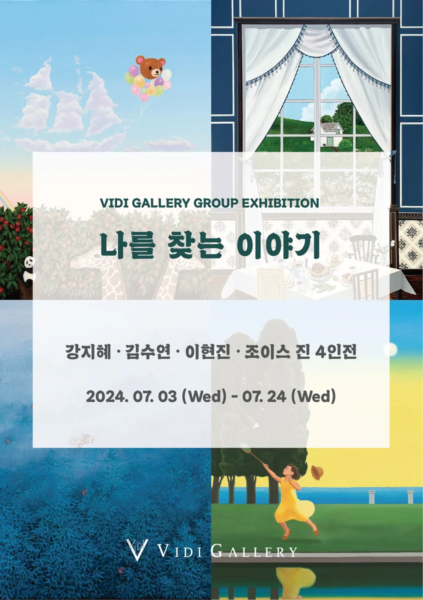 전시 개요 OVERVIEW 비디갤러리에서는 07월 03일부터 07월 24일까지 강지혜, 김수연, 이현진, 조이스 진 작가의 기획 초대전인 <나를 찾는 이야기>를 진행한다. 강지혜 작가는 현실에서는 볼 수 없는 이상적이고 꿈같은 세상을 그림 속에 구현해 내는 작업을 한다. 삭막한 현실에서 오는 피로감과 힘듦은 먼 곳의 이야기 같은 이상을 꿈꾸게 하였고, 작가는 그 갈망이 해소되길 바라는 마음을 작품에 담아냈다. 이러한 작품 속에는 하늘과 구름이 늘 등장하며, 구름은 일상에서 볼 수 있는 다양한 형상들로 이루어져 있다. 이것은 늘 가까이에 있지만 손에 닿을 수 없이 멀리 존재하는 하늘에 닿기 위한 장치로, 하늘의 상징물인 구름을 일상의 사물과 중첩, 병합시켜 우리 곁에 가까이 두고자 하였다. 즉 막다른 길, 닿을 수 없는 존재로 끝나는 것이 아닌 한계를 넘어서서 꿈이 이루어지도록 표현한 것이다. 김수연 작가는 언젠가는 사라질 추억들을 그대로 놓아두고 기억하기 위한 의도로, 본래의 모습을 온전히 간직하고 싶은 ‘기억과 추억’의 의미를 담아 그림을 그리고 있다. 작가의 작품 속에는 테이블이 등장하는데, 이는 서로의 이야기로 위로와 축하를 나누고, 지나간 좋은 추억을 상기함과 더불어 앞으로의 미래를 나누는 자리, 또는 혼자만의 여유를 즐길 때도 따뜻한 커피 한 잔이나 차 한 잔이 마음에 위안을 주기 때문이다. 음식이 들어간 풍경과 함께 계절의 변화를 통해 작품 속에서의 다과, 만찬의 시간에 그림을 보는 이들로 하여금 휴식의 감정을 전한다. 이처럼 작가는 테이블 위의 시간의 흐름에 따라 그때그때의 기억과 추억 그리고 감정을 대입시키는 작업을 하고 있다. 이현진 작가의 연작 ‘숨겨진 세상’은 여행을 하며 발견한 새로운 이미지들을 조합해 ‘나만의 공간’으로 재구성하는 방식으로 탄생하였다. 새롭게 구성된 풍경에는 작은 자동차와 기차, 그리고 장난감들이 부유하고 있는데, 이는 어딘 가에 정착하지 못해 불안정한 상태인 현대인들의 현실을 무겁지 않은 분위기로 나타내 주고 있다. 잎들 사이사이를 활보하는 여러 장난감과 피규어들을 작품 속에 장치해 둔 작가만의 현실도피 단서들이며, 무거운 현실의 짐을 내려놓게 해준다. 깊은 숲속 안개가 피어오르는 신비로운 세상을 통해 감상자들은 각자의 숨겨진 세상을 들여다보고, 보살필 수 있는 계기를 마련하게 된다. 현실과 이상의 경계를 넘나들며 만들어진 ‘숨겨진 세상’ 속의 재치 있는 요소들을 즐기며, 재미있는 상상과 함께 우리의 현실을 극복하며 살아가기를 기대해 본다. 조이스 진(Joyce Jinn) 작가의 ‘Discovery of the World-세상의 발견’은 아이들이 자신의 주변을 탐험하는 모습을 묘사한 유화 연작이다. 매일의 만남과 작은 탐험을 통해 아이들은 세상을 알게 된다. 아이들의 탐험은 항상 모험적이고 흥미로우며, 그 발견들은 무척 매력적이고 경이롭다. 그들은 스스로 만족스러운 답을 찾지 못할 때 “왜?”라는 질문을 끝없이 쏟아낸다. 따라서 이 작업의 기본 주제는 호기심이라 할 수 있다. 세월이 지나며 우리의 호기심은 닳아 없어지고 놀라움은 둔해지기 마련이지만, 작가는 여전히 작품을 통해 어른들도 어린 시절의 어느 부분을 다시 떠올리고 익숙한 경이로움을 느낄 수 있기를 바란다고 이야기한다.