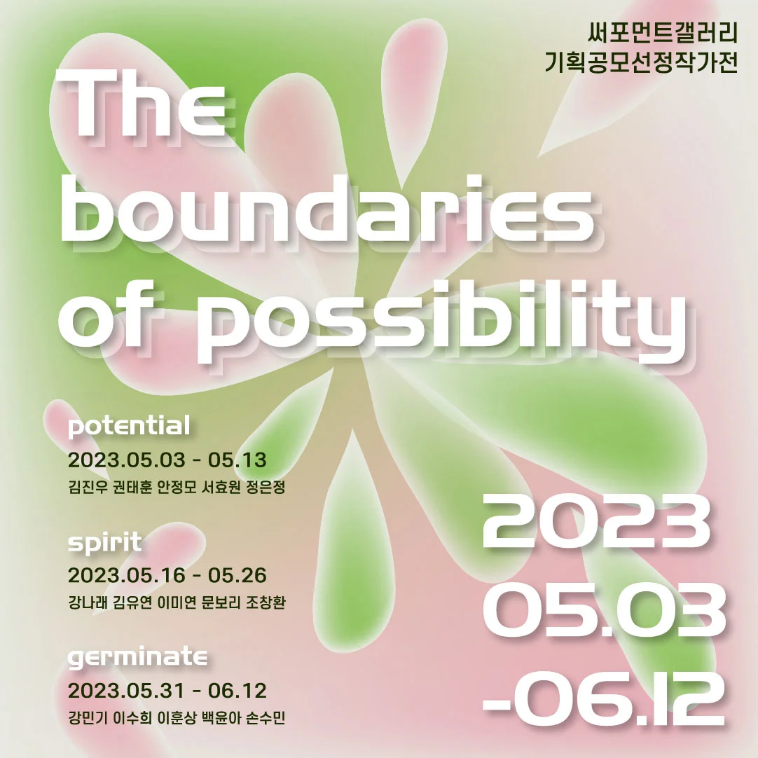 전시 개요 OVERVIEW 써포먼트갤러리 기획공모선정작가전 그룹전시 ‘The boundaries of possibility’ 전시가 진행됩니다. 전시는 5월 3일(수)부터 6월 12일(월)까지 진행됩니다. ‘가능성의 경계’라는 주제로 다양한 잠재적인 영혼들이 모여 예술의 영역을 무궁무진하게 보여줍니다. 각자 개성이 넘치는 15명의 아티스트들을 써포먼트갤러리에서 만나보세요. 《참여작가》 part 1. potential 2023.05.03. – 05.13 김진우 권태훈 안정모 서효원 정은정 part 2. spirit 2023.05.16. – 05.26 강나래 김유연 이미연 문보리 조창환 part 3. germinate 2023.05.31. – 06.12 강민기 이수희 이훈상 백윤아 손수민