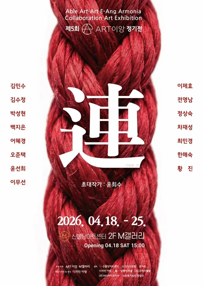 제5회 아트 이앙 정기전 : 연(連)展 Ableart 예술을 통해 장애를 뛰어넘어 새로운 가능성을 보여주는 <가능성의 예술> 활동 Art e ang 이앙은 못자리에서 기른 모를 본 논에 옮겨 심는 다는 사전적 용어로 아트이앙은 장애를 가진 작가와 비장애 작가와의 기획 전시로 확장 Armonia 조화, 하모니, 화합을 추구하는 예술활동 2026년 아트 이앙의 다섯 번째 전시 〈연(連)展〉은 서로 잇닿아 이어지는 관계, 즉 연대와 연결을 의미한다. 단순한 공존을 넘어 각자의 차이를 인식하고 영향을 주고받으며 새로운 가능성을만들어가는 과정을 뜻한다. 작품을 통해 형성된 연결이 관람객에게까지 이어지기를 기대한다. 김민수, 김수정, 박성현, 백지은, 이혜경, 오준택, 윤선희, 이무선, 이제효, 전영남, 정상숙, 차재성, 최민경, 한해숙, 황진