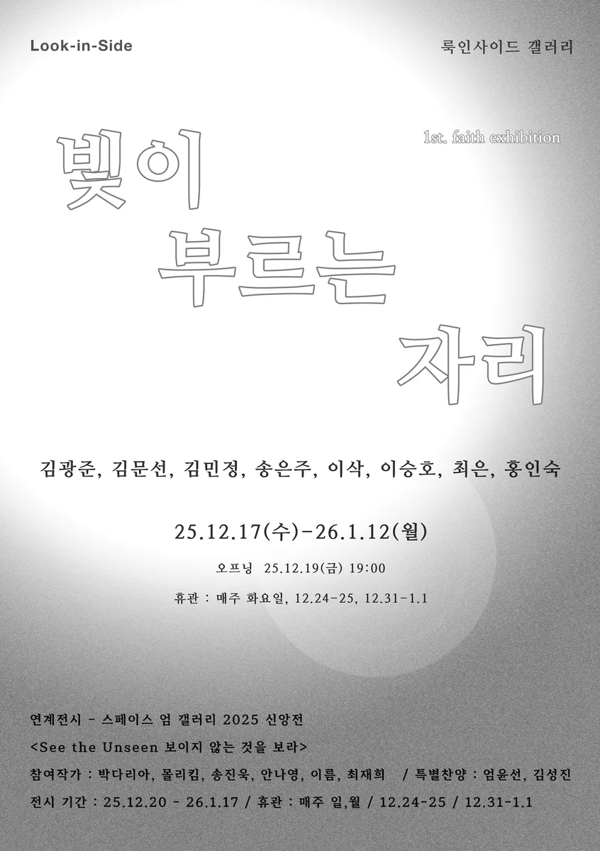 《빛이 부르는 자리》 룩인사이드 갤러리 대표 심재창 빛은 늘 우리 곁에 있지만, 우리가 그것을 어떻게 느끼는지는 각자의 자리마다 다르게 열립니다. 그 빛이 눈에 들어올 때 우리는 일상 속 작은 순간마저도 새롭게 마주하게 됩니다. 때로는 그 빛이 우리 내면의 문을 누군가 두드리는 부름처럼 들리기도 합니다. “빛이 부르는 자리”는 바로 그 부름의 순간들에 집중한 전시입니다. 빛은 우리가 잊고 있던 질문을 다시 꺼내게 하고, 삶의 의미와 관계, 그리고 내면의 감각을 열어 주는 힘입니다. 빛이 부르는 자리는 특정한 형식이나 생각을 강요하는 공간이 아니라, 우리 모두의 삶 속에 존재하는 ‘열림의 순간’입니다. 이번 전시는 사진, 회화, 설치 등 다양한 매체로 작업하는 8명의 작가 (김광준, 김문선, 김민정, 송은주, 최은, 이삭, 이승호, 홍인숙) 와 함께 공간의 다양성을 만들어 가는 여정입니다. 각자의 방식으로 빛과 그림자, 형상과 여백, 보임과 보이지 않음의 경계를 탐색하며, 하나의 공간 안에 여러 방면의 이야기를 펼쳐 보입니다. 모든 매체는 각각의 방식으로 빛의 부름이 머무르는 자리를 보여 줍니다. “빛이 부르는 자리”는 작품 앞에 서있는 시간 자체가 우리에게 질문을 던지는 자리입니다. 관람자는 작품 속의 빛과 이미지를 마주하며, 스스로의 삶과 기억, 그리고 일상에서 놓쳤던 생각들을 다시 떠올릴 수 있습니다. 이 과정은 어떤 정답을 찾기 위한 것이 아니라, 각자의 삶 속에서 의미를 찾아가는 편안한 여정이 될 것입니다. 또한, 이번 전시는 스페이스 엄 갤러리의 “보이지 않는 것을 보라” 신앙전과 연계해서 함께 진행됩니다. 두 공간은 서로 다른 방식으로 이야기를 풀어가지만, 현실 너머의 의미와 진정성, 관계의 깊이를 묻는 흐름으로 이어집니다. *출처 및 제공: 룩인사이드