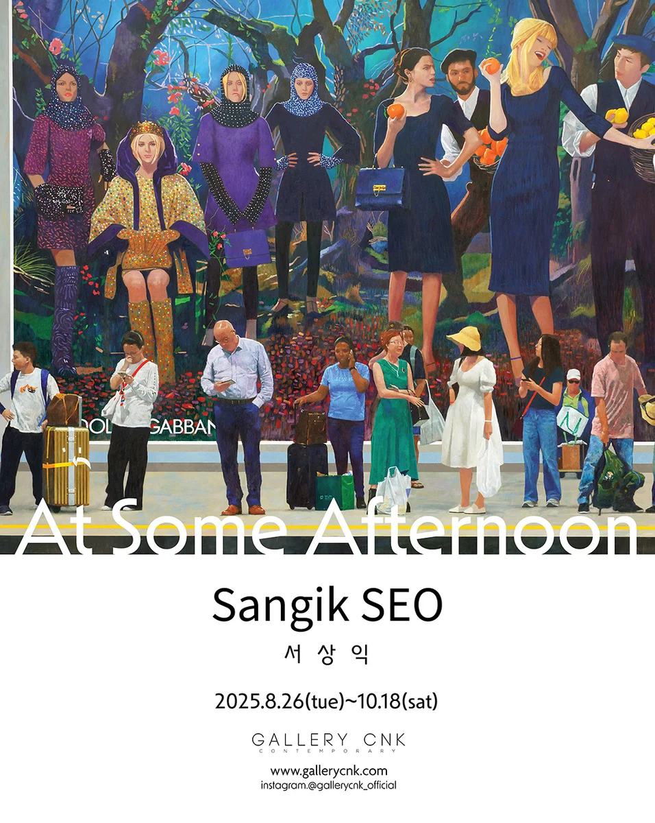 전시 개요 OVERVIEW 서상익 Sangik SEO (b. 1977) 2025. 8.26 ~ 10.18 갤러리CNK는 회화의 전형을 보여주는 서상익 개인전 《At Some Afternoon》 을 개최한다. 삶의 단편을 순간의 정지화면처럼 펼쳐내며, 시간을 초월하는 작가만의 공간 구성으로 현실과 초현실이 공존하는 화면이 펼쳐진다. 이번 전시에 소개되는 작품들은 회화, 평면성이라는 장치를 가지고 특유의 회화적 행위와 구성을 이어가는 작가의 대표작품들과 최신작들을 함께 전시함으로써 서상익만의 시선과 Concept의 변화를 한 공간에서 볼 수 있다. 그의 대표 시리즈인 큰 광고판을 모티브로 한 연작들과 <화가의 성전>시리즈, 미술관의 내 외부를 배경으로 한 연작들을 보면 3차원의 실제 장면과 시공간의 차이를 두고 겹쳐지는 이중구성을 볼 수 있다. 한낮의 빛과 그림자, 공기의 흐름이 이미지들 사이로 스며들며 실체와 상징이 바뀌고 레이어가 겹쳐지며 원근을 깨는 순간을 경험한다. 이러한 현실과 초현실의 공존은 어떤 것이 더 진실한 이미지인가를 끊임없이 묻게 되고 기존의 관념에 반문하게 된다. 이번 전시의 대표작이기도 한 <거대한 일상>은 유럽 고전을 바탕으로 한 강렬하고 신비로운 환상의 장면을 나른한 오후 일상의 순간 위로 겹쳐지게 구성하며 실체가 무엇인지 관람자에게 묻고 있다. 거대한 명품 광고, 자본주의의 상징인 광고판 이미지에 일상의 장면을 교차하여 연출하며 그의 무대를 만들어내고 관람자는 교차된 이미지들을 따라 실체를 찾아간다. 이중프레임의 기법이 느껴지는 것은 원근이 깨지며 하나의 이미지가 주인공이 될 수 없는 구도 때문일 것이다. 미술관의 내 외부를 배경으로 한 그의 대표적 연작인 <익숙한 풍경>시리즈라고 할 수 있는 <The long and winding road>,<전시된 비극>,<신화의 기원> 작품들은 미술관에서 우리는 무엇을 보는가? 예술의 기준은 무엇인가? 미술관의 권위는 어떻게 만들어지는가? 라는 질문에서 시작한다. 서상익의 미술관 연작 속에 표현되는 상징적 피사체들은 미술관이라는 공간에 놓여짐으로써 의미가 부각되거나 혹은 변화하는 모습을 보여준다. 환상과 실체, 생명의 희극과 죽음의 비극은 미술관의 공간에서 조형적으로 다시 연출된다. “학문도 예술도 모두 권력 구조 속에 존재하게 되고, 우린 권위에 기대어 감상하게 된다. 언어도 체계도 모두 라벨링과 권력의 속성을 가지고 있기에 어쩌면 우리에게 완전히 자유로운 표현과 감상은 이상일 뿐일지도 모른다. 결국 인식체계 자체가 구조적 권력구조 안에 이뤄지므로 우린 권위를 일정 부분 인정해야 한다. 하지만 주객이 전도되어 권위가 가치를 만들어내는 현상에 대해서는 경계해야만 한다.”-서상익 <화가의 성전> 속 명작의 재현은 서상익을 통해 다시 태어난다. 이 시리즈는 단지 묘사된 이미지를 보는 것이 아니라 대가들의 작품과 그들의 아우라가 현실과 초현실로 공존한다. 예술가로서의 신념을 실현한 그들의 오마주이며 재창조된 서상익의 시선이다. “..나의 선택과 노력이 만들어낸 오롯이 ‘나의 것’이라고 강하게 믿어 왔던 많은 것들이- 관계를 맺어 왔던 모든 이들과 환경의 필연임을 깨달아가고 있다….. 그런 의미에서 이 전시는 나에게 소중하다….. 난 무엇으로 만들어졌는가” -서상익 다시 회화이다.