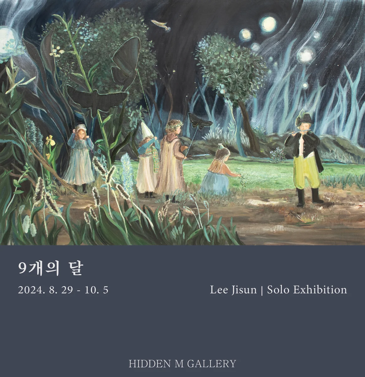전시 개요 OVERVIEW 히든엠갤러리는 8월 29일부터 10월 5일까지 이지선작가의 개인전 <9개의 달>展을 개최한다. 본 전시에서는 ‘세번째 밤의 꿈’, ‘밤 수집가’ 연작을 포함한 신작 30여 점의 <9개의 달>시리즈를 선보인다. <9개의 달> 시리즈는 깊이를 알 수 없는 밤의 숲을 배경으로 하고 있다. 이지선작가는 9개의 달이 빛의 휘장처럼 밤하늘을 비추는 비현실적인 풍경을 통해 상상 속 밤과 현재의 밤이 혼재된, 아늑한 유년의 시점이 휘장처럼 드리운 내면 풍경을 담아내고자 했다. 이는 내면세계를 재발견하여 내적 성장을 도모하는 동시에 작가 자신의 내면, 더 나아가 인간 내면을 탐구하려는 기록이 된다. 이지선작가의 작업은 유년기의 기억과 상상이 담긴 내면세계를 발견하며 시작된다. 일상에서 어린 시절의 천진함을 상기시키는 감각이나 감정을 마주하게 되면, 사회의 기준을 향해 애쓰던 작가의 내면은 무의식 깊은 곳에 방치되어 있던 자유롭고 천진한 세계를 바라보게 했다. 그곳은 사회의 원칙이나 내적 검열을 의식하기 이전의, 순수하고 깊은 내면의 한 공간이었다. 이러한 작가의 시선은 자연과 가까이 지낸 그녀의 성장기 시절 집에서 출발한다. 주변의 한적한 풍경 속에 상상과 이야기들을 채워 시간을 보낸 기억, 이국적인 문학과 이미지들을 동경하듯 수집하여 상상여행을 떠나곤 했던 경험과 삽화 속 인물이 친구가 되어 자기만의 세계에서 시간을 보낸 아늑한 감정들이 일종의 향수로 남아 작가의 무의식에 자리하게 된 것이다. 작가에게 무의식의 세계는 그 깊이를 알 수 없는 거대한 밤의 숲과 같다. 그녀는 밤의 심연을 향해갈수록 평소에는 인지하지 못한 유년의 기억과 순수, 무용한 것들을 새로운 의미로 재발견하는 과정을 내면을 탐색하는 여정이라 보았다. 밤의 숲에는 오래전 수집한 삽화 속에서 나올법한 인물들이 내적 세계를 수호하듯이 자유롭게 흘러나와 함께 비밀스러운 놀이를 하거나 자기들만의 의식을 하며 향수 어린 세계에 다가가려 한다. 이처럼 캔버스 속 공간은 내면의 숲이 되어, 내밀한 기억과 경험, 상상이 현재의 작가 자신과 만나 그물망처럼 엮이는 세계가 된다.