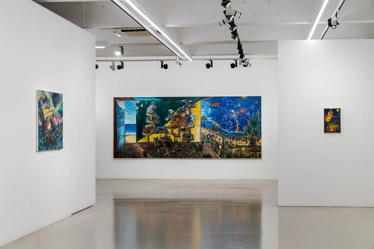 전시 개요 OVERVIEW 갤러리바톤은 2022년 6월 29일부터 7월 30일까지 배윤환(Bae Yoon Hwan, b. 1983)의 개인전 《What? In My Back Yard?!》를 개최한다. 다양한 매체로부터 직간접적으로 취득한 정보와 경험을 회화적 스토리텔링에 유려하게 녹여내며 회화의 의미와 가능성의 확장을 탐구해왔던 배윤환이, 바톤에서 여는 두 번째 개인전을 통해 신작을 선보이는 자리다. 미술계의 관행에서 볼 때 사십대 초반의 배윤환 작가는 아직 작가로서 정진하고 성취해 나가야 하는 여정의 중간 어딘가에 있는 것으로 보인다. 하지만, 그의 삼십대를 유심히 지켜봐 온 사람들은 지치지 않은 실험 정신으로 무장하고 자신의 체력과 정신의 한계를 매 순간 시험하듯 매진하던 태도와 그 결과물들 또한 기억한다. 예를 들어 서울시립미술관(SeMA) 커미션 작품이기도 한 11분 40초 러닝타임의 〈스튜디오 B로 가는 길(Road to Studio B)〉(2018)은 드로잉과 설치 및 클레이아트가 결합된 비디오 작품인데, 수천수만 번의 드로잉과 조소 작업, 그리고 동영상을 만들기 위한 매 컷의 촬영을 근 반년 이상을 칩거하며 오롯이 혼자 감당해가며 완성한 작품이다. 다양한 군상의 예측 불가능한 스토리텔링을 보는 즐거움 이외에, 작가로서의 인간이 가진 미적 추구에 대한 욕망과 그 극한의 노고에 경외감까지 느끼게 한다. 그보다 앞서 배윤환식 화법의 본격적인 등장이라고 할 만한 2014년 인사미술공간 전시도 같은 맥락에서 조명해 볼 필요가 있다. 전시명이기도 한 〈내가 본 게 고양이야?(WAS IT A CAT I SAW?)〉(2014)는 2.2미터 높이의 50미터 폭을 가진 초대형 회화 작품이다. (그 규모로만 볼 때 한국 현대 미술사를 통틀어 몇 손에 꼽힐 정도의 대작이다). 10평 남짓한 작업실에서 몇 미터 단위로만 펼쳐 놓기를 반복하며 완성했다는 작품은 2층 전시실 벽면을 꽉 채우고도 반 이상은 감겨 있는 상태로 전시되었다. 그 압도하는 크기와는 별개로 50미터의 대작은 그 디테일에 있어 작가의 집요함을 짐작게 하였고, 창작의 원천으로서 자신이 가진 상상력의 광활함을 증명해 보이는 계기이기도 하였다. ‘양(量)의 시대’를 실험 정신으로 무장하고 자신에게 무한정 돌진해오는 이미지들의 개별 의미를 파악하고 선별적 채집에 매진하였던 배윤환에게, 이번 전시는 캔버스 안에서 보다 정제된 하나의 집합적 내레이션을 끌어내려던 최근 수년간 시도의 결과물들이다. 전시 제목인 “What? In My Back Yard?!”는 현대사회의 특징 중 하나인 님비 현상이 유추되는 감탄사인데, 이는 이번 전시에서 선보이는 작품들이 사회적 이슈 또는 전 지구적 현상과 연관 있음을 떠올리게 한다. 하지만, 의인화된 동물들을 등장시켜 위트 있게 각자의 행동에 몰두하듯이 묘사한 장면들은 자칫 숨겨진 주제의 무게가 줄 수 있는 심각성을 경감하거나, 여기에 맞서 보편적인 회화적 순수성을 지켜내도록 설계되어 있다. 화면마다 고유하게 설정된 레이아웃과 명암 아래 필요한 이미지와 서사를 정교하게 적소에 배치하는 배윤환의 숙련된 기법은, 표면적으로는 아이소포스풍인 작품의 기저에 자못 무거운 듯한 주제가 은밀하게 공존할 수 있는 자리를 마련해 준다. 피곤해 보이는 늑대와 우스꽝스럽게 분장한 분주한 토끼들이 등장하는 〈송곳니들을 위한 자장가(Lullaby for Fangs)〉(2022)는 실제 미국과 호주에 도입된 동물의 개체 수 조절 프로젝트의 이면을 들추어낸다. 멸종 위기종에서 개체 수의 증가로 졸지에 미 주정부들의 공식 퇴치 대상이 되어버린 늑대가 불면증에 빠지자, 백 년 이상 된 호주의 개체 수 조절 정책에서도 번성해 온 토끼들이 나서서 자신들이 터득한 기법을 동원하여 늑대를 돕는다는 발상이 화려한 채색으로 생동감 있게 표현되어 있다. 화면을 사선으로 가로지르는 큰 바위 위의 토끼들과 왼편 하단에 웅크린 늑대의 극적인 대비를 통해, 다른 시차와 공간을 두고 발생한 사건의 경과가 두 집단의 먹이 사슬적 구도를 거스르고, 새롭게 우열을 규정하고 있음을 우회