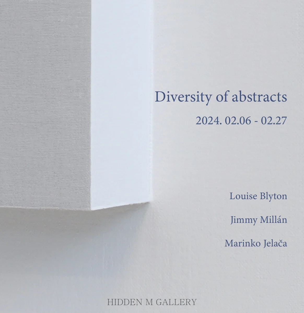 전시 개요 OVERVIEW 히든엠갤러리는 2월 6일부터 2월 27일까지 Louise Blyton, Jimmy Millán, Marinko Jelača작가의 3인전 <Diversity of abstracts> 展을 개최한다. 루이스 블라이턴(Louise Blyton)은 호주 출생으로 호주 뿐 아니라 미국, 유럽에서 여러 전시를 개최했으며 현재 활발하게 활동을 하고 있다. 작가는 색, 질감, 형태의 결합을 구현한 명쾌하고 조화로운 다차원적인 작업을 한다. 작가는 명상을 통해 자연미를 찾는 것에 집중하며 작업을 하는 동안 빛, 그림자, 색상의 관계가 진화하는 방식에 대해 생각한다. 가공처리를 하지 않은 린넨 위에 채색을 하고 그것이 조화를 이루며 형태의 특성이 변하는 것에 주목한다. 작가는 이러한 변화를 중심적으로 고려하며 작품으로 승화시킨다. 또한 그녀의 작품은 벽에 걸 수 있도록 디자인된 모양과 최소한의 캔버스 등 작가의 완성된 작품들은 전통 회화와 조각 사이의 경계 구역을 차지하고 있다. 지극히 자연스럽고 꾸밈이 없는 단순함이지만 그것은 작품의 구성 단계에 들어가는 상당한 시간과 노력을 보여준다. 이 작가는 그 위에 그래픽과 컬러를 사용하는 본인만의 접근으로 작가의 작품을 관람하는 관객들에게 특별함을 선사한다. 지미밀란(Jimmy Millán)은 스페인 출생으로 다양한 재료를 활용하여 섬세한 작업을 선보이고 있다. 작가의 대표작은 단연 얼굴 초상으로 개개인의 영혼을 담고 있다. 그것은 복잡한 현실 사회의 단면도 담고 있다. 세상의 모든 사람이 가지고 있는 ‘독특함’처럼 각자의 ‘얼굴’은 구체적이고 객관화된 초상이 아닐 것이다. 그 ‘얼굴’은 그들 각자의 감정, 정신, 기분 상태에 대한 주체성의 반영이자 다른 면에서는 우리 사회가 요구하는 인간상에 대한 이상적 해석이다. 그는 ‘영혼의 거울’이라는 작가 자신만의 집념을 담아 작업한다. 평면적 모양과 색상 뿐 아니라 입체적 질감으로 자신의 아이디어를 표현하며 그는 자신만의 호기심과 영혼을 작품에 담기 위해 콜라주, 아크릴, 유화 등 다양한 혼합 매체 기법들을 사용한다. 작가는 보이는 모든 것을 관찰하고 그것을 사진에 담았다. 그것은 끈임 없는 상상으로 이어졌다. 작가의 생각, 기억, 꿈, 현실이 작품 해석의 대상이 되었다. 작가는 심리분석을 하듯 생각과 기억, 꿈을 통해 탐구하였으며 그것들이 의심할 여지없이 ‘내가 누구인지, 내가 어떻게 행동하는지’ 크게 인식하고 그의 현실이 기반이 되는지 기록하였다. 이러한 작가의 기록은 곧 작품에서 보여지고 있다. 작가의 생각들을 패턴과 형태의 반복, 때로는 강박관념 등 마치 각기 다른 모양과 색감으로 드러났다. 또한 이런 작가의 기록이 추상적이거나 혹은 그의 새로운 상상력으로 추상적인 형태를 나타내거나 색감을 통해 동양적인 느낌도 보여주고 있다. 또한 그의 작품안에 주된 특징 중 하나는 붉은 점 (The red dot)에 대한 맹목적 집착이다. 초상화 작업에 항상 등장하는 붉은 점은 그의 작업을 감응하고 해석하는 필수적 사고의 창으로 여겨진다. 그 점은 우리가 삶을 살아가는 하나의 방식의 상징으로써 작가에 의해 반영되어 진다. 마린코제라카(Marinko Jelača)는 크로아티아 출생으로 조각이 작가의 첫 예술적 기반이 되었다. 작가는 전형적인 조각적 사고 방식에서부터 다양한 재료를 시도한다. 실험적인 작업을 넘어 색과 그래픽을 작품에 도입하는 것을 볼 수 있다. 작가는 그래픽을 사용함으로써 형태가 드러나고, 좀 더 세련되고, 서정적인 터치감이 느껴진다. 선과 다른 형식적인 요소(텍스쳐, 점, 얼룩, 구성)의 아름다움과 풍요로움, 그리고 이러한 요소들을 다루는 것이 나를 에너지로 가득 차 있는 비범하고도 동시에 친밀하고 따뜻한, 생동감 넘치는 작은 우주의 세계로 들어가게 한 것이다. 이 길은 작가의 만물의 시작, 너무나 미묘하고 어디에도 방해받지 않는 고풍스럽고 신비한 수중 세계로 이끌었다. 바다와 지중해에 소속되어 있다는 강한 느낌이 그의 시각적 표현을 만들어주었다. 형태를 더하고 자르는 일반적인 조각 과정들은