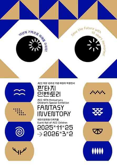 소개 ACC 개관 10주년 기념 어린이 특별전시 《판타지 인벤토리(Fantasy Inventory)》는 개관 10주년을 기념하여 어린이문화원의 10년간의 기억을 되돌아보고, 앞으로 다가올 미래 10년의 기억을 마련하고자 기획되었다. 어린이가 주체적으로 자신과 타인의 기억을 들여다보며 미래 기억을 상상함으로써, 창의성, 독창성을 고양하는 전시이다. 게임을 즐기듯이 이야기를 따라 물건과 기억을 교환하다 보면, 자신만의 인벤토리인 ‘환상의 수납장’에 새로운 미래 기억을 모을 수 있다. 전시장 내 퀘스트를 수행하면 행운의 아이템을 '미래 기억 대장간'에서 얻을 수 있다. 《판타지 인벤토리》 전시는 프롤로그인 ‘기억의 통로’를 시작으로 ‘미래 기억의 서, 판타지 캐릭터 캠프, 기억의 초원, 기억의 숲, 인공지능 루니(RUNI), 기억의 강, 기억의 전당’ 등 총 9개의 액트(ACT), 에필로그 ‘미래 기억 대장간’으로 구성되었다. 관람객의 임무는 액트별로 퀘스트를 수행하며 과거의 기억을 모아 미래를 구하는 것이다. 퀘스트를 모두 수행한 관람객은 자신이 모은 기억으로 만든 선물을 받을 수 있다. 전시에는 김설아, 천영록, 표인부, 루카스 실라버스(M. Lugas Syllabus, 인도네시아), 장전프로젝트(장준영&전지윤), 황문정, 소보람, 이연숙 등 총 8명/팀이 참여한다. 참여작가 김설아, 천영록, 표인부, M. 루카스 실라버스(M. Lugas Syllabus), 장전프로젝트(장준영 & 전지윤), 황문정, 소보람, 이연숙 전시 가이드 리플릿에 퀘스트를 수행하며 마주한 기억을 적어 나만의 인벤토리를 만들어보자! 입장 후 키오스크에서 자신만의 출입증 만들기 키오스크에서 <바람의 모양> 20개 이미지 중 1개를 선택하고 확인 버튼을 누른다. 선택한 <바람의 모양>, 출입 번호 등 입장 정보가 바코드에 기록된 출입증 스티커가 나온다. 자신의 출입증을 리플릿에 붙였다면 전시 관람을 시작한다. 액트별 퀘스트를 완료하면 출입증의 바코드를 액트별 리더기에 찍어 활동을 기록한다. 퀘스트 수행 하기 0 프롤로그 기억의 통로 등록하기 등록 키오스크에서 <바람의 모양> 20개 이미지 중에서 1개를 골라 자신만의 등록증 스티커를 출력하고, 리플릿에 스티커 붙이기 1 액트1 미래 기억의 서 『미래 기억의 서』 를 읽고, 여정 알아내기 2 액트2 판타지 캐릭터 캠프 나만의 가면 만들기 거친 여정을 수행하기에 앞서 자신만의 가면을 만들어 쓰기 3 액트3 아이의 기억 인벤토리 물물교환하기 기억을 모으기 위해 가져온 물건과 교환하기 4 액트4 기억의 초원 이파리 5잎 이상 붙이기 기억의 초원을 소생하기 위해 이파리에 자신의 기억을 적어 초원에 붙이기 5 액트5 기억의 초원 과거 ‘기억의 숲'에 살았던 동물, 식물 등 여러 정령의 기억을 찾아 적기 6 액트6 인공지능 루니 ‘기억의 초원'을 지키는 수호 존재인 인공지능 루니(RUNI)를 깨우기 위해 루니와 춤추기 7 액트7 추억의 낱말 미래 기억으로 사용할 과거의 기억 수집하기 공을 치면서 과거 어린이문화원의 10년 기억을 알아내고 그림이나 글로 활동지의 빈 칸에 기록하기 무작위적으로 바닥에 만들어지는 구멍에 공을 넣어 기록들을 보기 8 액트8 기억의 강 미래 기억으로 사용할 과거의 기억 수집하기 얼어붙은 강 표면을 물로 문질러 떠오르는 기억을 활동지의 빈 칸에 그리거나 적기 9 액트9 기억의 전당 미생물과 신화, 어린이문화원의 기억을 직조하여 가져온 물건의 위치를 찾아 물물교환하기 10 에필로그 미래 기억 대장간 퀘스트 활동 기록으로 자신만의 미래 기억 고리 만들기 액트별로 설치된 바코드 리더기에 자신의 바코드를 찍었다면, 그 기록을 바탕으로, 키링, 팔찌 등 선물 받기. 완료한 활동에 따라 다른 선물 증정 만든 미래 기억 고리를 SNS에 올리고 인증샷을 inventory@accf.or.kr로 보낸다. ‘좋아요’ 숫자가 높은 기억 고리에 대해서는 특별 선물이 증정! 전시작품 미래 기억의 서 “빙하기가 다시 시작되었습니다. 마지막 생명의 숨은 공기 속으로 사라지고, 미래 기억은 저 깊은 땅속으로, 물속으로