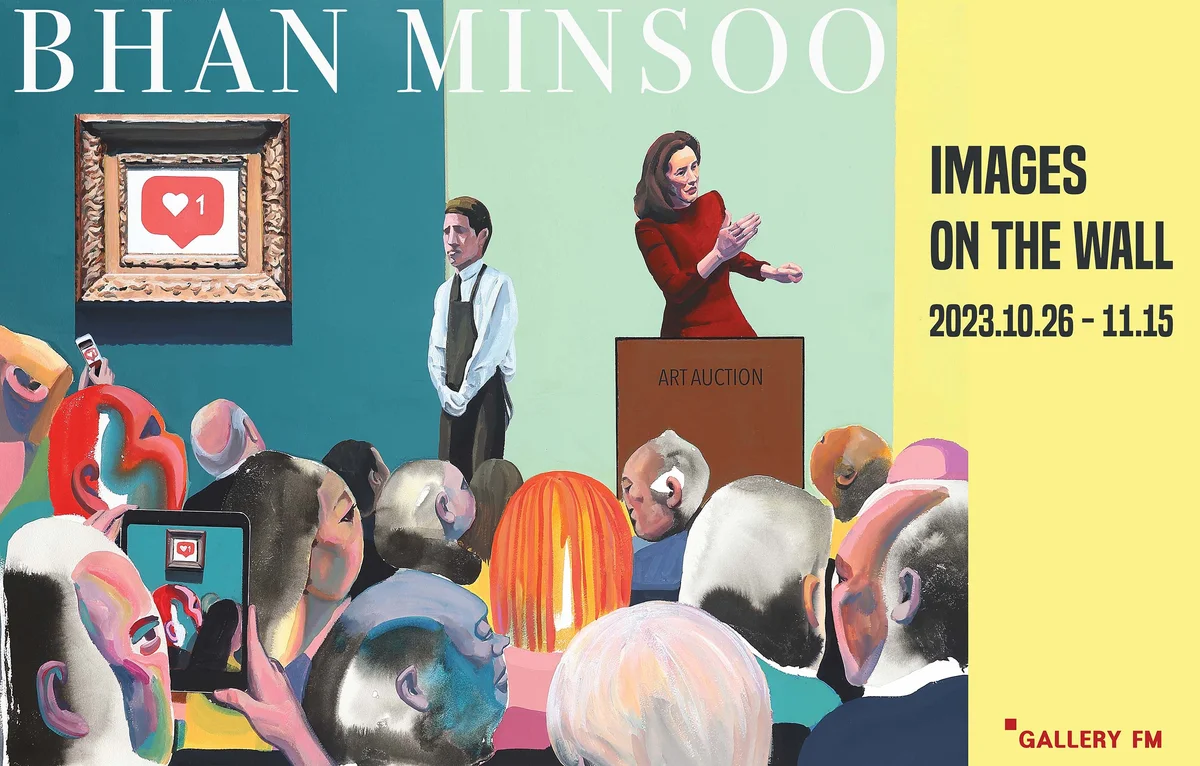 전시 개요 OVERVIEW 갤러리FM은 2023년 10월26일부터 11월 15일까지 반민수 작가의 《IMAGES ON THE WALL》 을 개최한다. 물과 잉크의 불확실한 흐름의 과정을 거친 후 드러나는 최종 형상 위에 얼굴을 그려 넣어 군중을 표현하는 그의 기법은 그 자체로 불확실성을 가지며 ‘삶의 불투명함’과 ‘회화 자체의 불확실성’을 드러내는 방법이다. 그의 회화에서는 가상 같은 현실, 현실 같은 가상의 장소와 시간 속에서 유영하는 얼굴들이 존재하는데 이 불안정한 얼굴들은 서로 한데 모여 가야할 길 위에서 망설이고 있다. 그동안 반민수의 군중들은 거친 바다를 건너오기도 하고 소문난 맛집에 긴 줄을 서기도 했으며 락 페스티벌과 시위 현장에 앉아 있기도 했다. 그리고 이번 전시에서는 미술관과 아트페어, 그리고 옥션 현장에 들어서있는 군중들을 마주할 수 있다. 작가는 2022년부터 “ART” 시리즈 작업을 이어오고 있는데, 이 시리즈에서의 많은 사람들은 미술관과 경매장 내 벽에 걸려 있는 그림을 바라보고 있다. 과연 이들이 바라보고 있는 이미지들은 무엇이며 무엇을 느끼고 있을까? 이 시리즈는 작가가 전시장에 들어설 때마다 갖게 되는 첫 느낌으로 시작되었다. 마치 신성한 장소에 서 있는 것 같은 신비로운 느낌과 동시에 전시된 작품에서 느껴지는 ‘낯선 감정’으로 인간이기에 가질 수 있는 모든 불완전함, 결함들 그리고 흔들리기 쉬운 모든 감정에 관심을 갖고 작가는 쉽게 방향을 잃어버리고 다시 길을 찾으려는 사람들과 미래의 불확실성을 안고 걸어가는 모든 삶들의 지점에서 작업을 시작한다. 이번 시리즈의 대부분은 작가가 2013년 로마 여행 중 미술관에서 받았던 기억에 기인하고 있으며 또한 대형 아트페어에서 받았던 그의 감정과 생각이 담겨있다. 당시 느꼈던 ’공감하지 못하는 슬픔’ 이라는 주제를 여러 작품 앞에 모여든 관객들 뿐만 아니라 때로는 작품 속으로 들어간 관객들을 통해 이번 작품에 표현했다. 이번 전시에서 작품 속의 가상 세계와 미술관이라는 현실세계 사이 가운데에서 낯선 감정으로 서 있는 평소의 우리의 모습을 느껴보는 시간을 가져 보시길 바란다.