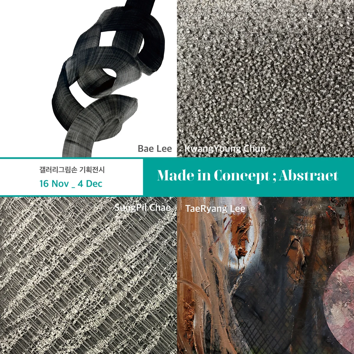 전시 개요 OVERVIEW 갤러리그림손 <Made in Concept ; Abstract> 기획전은 4명의 각각 자신만의 개념을 가지고 추상작업을 하는 작가들로 구성하였다. 이배, 전광영, 채성필, 이태량 4명의 작가로 구성된 이번 전시는 현대미술에서 작가의 철학, 작가의 개념을 확실히 탐구하여 자신만의 아이덴티티를 구축한 작가들의 작품을 통해 동시대 현대미술의 동향과 상황의 변화를 알아보고자 한다. 꾸준히 국내외 활발하게 활동하는 이배 작가는 숯을 통해 생성과 소멸, 순화에 대한 정의를 표현하고 있으며, 붓질은 한국 수묵화의 기본을 바탕으로 한국적 정서를 이야기 하고 있다. 전광영 작가는 한국 전통한지를 싸고 접으면서 모인 군집조형으로 거대한 입체를 만들거나 다양한 구조물로 표현하는 작가이다. 작가는 이러한 반복적인 행위가 모여 우리가 살고 있는 삶의 역사적 사건, 사회적 사건에 대한 흔적이라고 말하고 있다. 한지 조각을 붙이는 행위를 통해 삶과 죽음에 대한 철학을 담고 있다. 채성필 작가는 흙을 이용하여 대지와 우주의 근본을 이야기 하고 있다. 인간은 흙에서 태어나 흙으로 돌아가는 순환 구조와 자연 또한 우주의 한 부분으로 순환과정을 동양의 오행과 서양의 4원소로 표현하고 있다. 이번 전시에 사계절을 의마하는 듯한 색의 변화와 조형성으로 신작을 선보인다. 이태량 작가는 꾸준히 존재와 사고, 명제형식 시리즈를 통해 그림이 갖는 형식은 과연 어디까지를 명제하는 가를 제시하고 있다. 비트겐슈타인의 비가시적인 영역을 작가만의 시각언어로 표현하며, ‘중요한 것은 그림밖에 있다’. 라는 개념을 기본으로 추상표현을 하고 있다. 이렇듯 4명의 작가는 각자만의 이상과 심미안을 가지고, 자신의 이야기를 보여주고 있다. 이러한 이야기는 작가만의 컨셉이 되어 우리에게 감동을 주고, 생각을 공유하게 한다. 이번 기획전을 통해 현대미술에서 활발하게 활동하는 4명의 작가가 우리에게 전달하고자 하는 소리를 시각적으로 느끼기를 바라는 의미에서 기획하였다.