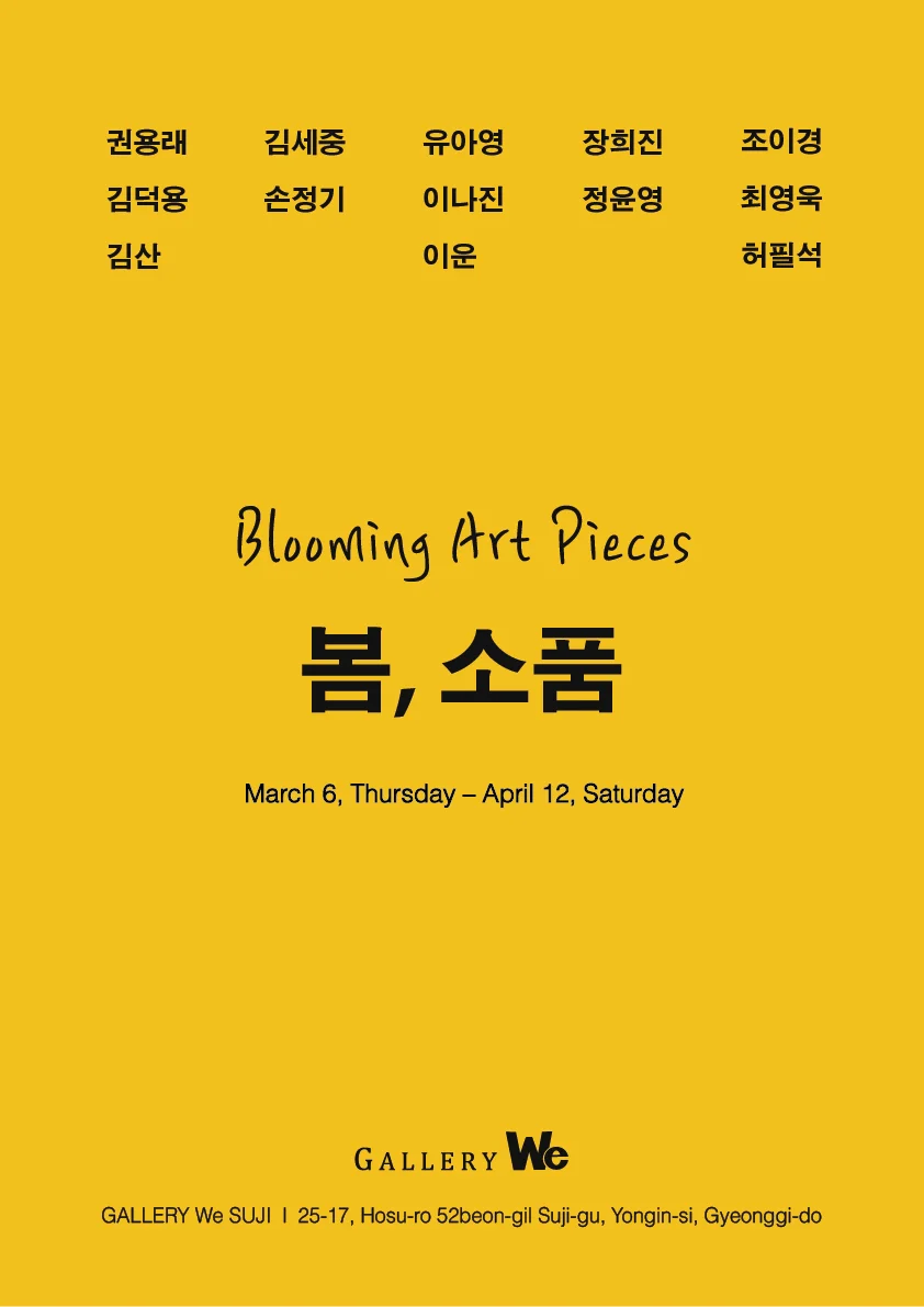 전시 개요 OVERVIEW GALLERY We 봄소품 2025년 3월 6일(목) – 4월 12일(토) – 매년 선보이는 갤러리위의 봄맞이 소품 전시 ‘봄소품’이 3월 6일부터 열린다. 봄소품은 20호(73x61cm) 미만의 비교적 작은 작품만 전시한다. 작은 틀 안에 무한한 이야기를 담아내는 소품은 부담 없는 크기와 가격, 작은 캔버스에 집약시킨 세밀한 작가 미학으로 관람의 즐거움과 수집의 기쁨을 모두 충족시키는 매력을 가졌다. 크기가 작다는 것은 결코 그 깊이와 가치를 제한하지 않는다. 오히려 불필요한 요소를 걷어내고, 작가의 의도와 감정을 밀도 있게 담아낸다. 한눈에 들어오는 크기 덕분에 관람객은 작품과 더 가까이 마주할 수 있고, 작은 세부 요소 하나하나는 더욱 선명하게 빛난다. 이번 전시에는 권용래, 김덕용, 김산, 김세중, 손정기, 유아영, 이나진, 이운, 장희진, 정윤영, 조이경, 최영욱, 허필석 등 13인의 작가가 참여해 60여 점의 작품을 선보인다. 크기의 제약을 넘어 농축된 이야기들이 주머니 속 보석처럼 작지만 결코 가볍지 않은 빛을 전할 것이다. 갤러리위 수지ㅣ 031.266.3266 gallerywe@gallerywe.com www.gallerywe.com 경기도 용인시 수지구 호수로 52번길 25-17 OPENING HOURS ㅣ TUE-SAT 10AM-6:30PM DAY OFF l SUN-MON, Public Holiday 031.266.3266 ㅣ 쾌적한 관람을 위해 예약(전화, 네이버) 후 방문 가능합니다.