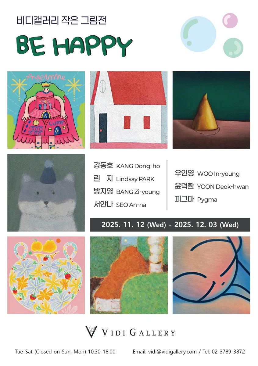 전시 개요 OVERVIEW 비디갤러리에서는 11월 12일부터 12월 03일까지 작은 그림전 <BE HAPPY>를 진행한다. ‘행복’은 먼 곳이 아닌, 고개를 들면 닿는 일상의 틈새에 숨어 있다. 이번 <BE HAPPY>展은 각기 다른 시선으로 그 작은 틈을 포착해 온 일곱 명의 작가들이 모여, 마음의 온도를 전하는 회화의 힘을 보여준다. 누군가는 기억의 흔적을 따라, 누군가는 자연의 숨결 속에서, 또 누군가는 깊고 고요한 시간을 지나며 자신만의 평온을 찾아간다. 이처럼 자유로운 상상과 다정한 시선, 그리고 개별적 사유들이 서로 다른 색으로 번져나가며, 내면을 향한 항해를 시작하게 된다. 각각의 작품은 현실과 환상, 위로와 치유, 기억과 꿈이 공존하는 작은 세계를 품고 있다. 그 안에서 우리는 감정의 다양한 형태를 발견하게 되고, 자신의 행복이 어디쯤 머물고 있는지 조용히 되묻게 된다.