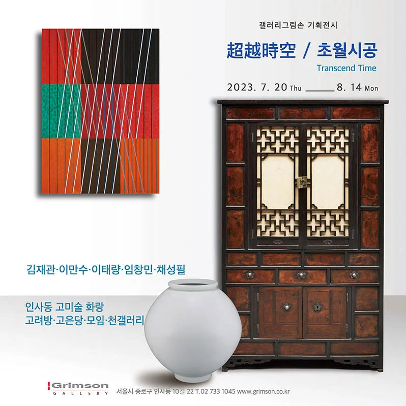 전시 개요 OVERVIEW ‘초월시공’ 전시는 매년 인사동 고미술화랑과 갤러리그림손이 협업하여 전통가구와 현대미술의 조화를 통해 과거와 현대를 잇는 예술적 가치를 재조명 하고자 하는 전시이다. 올해 6회째를 맞이하는 기획전으로 매년 전통가구(반닫이, 사방탁자, 관복장, 약장, 자개장, 이층농, 지장 등) 와 현대미술의 만남으로 옛 것에 대한 가치부여와 현대미술의 우수성을 함께 보여줌으로써 전통과 현재가 여전히 조화를 이루고 사랑 받고 있음을 알 수 있는 전시이다. 전통가구는 그 시대의 생활양식을 그대로 나타내고 있으며 사회적 구조, 자연환경, 관습에 따른 실용주의적 조형미를 가지고 소박하거나 때론 화려하게 자연미를 표현하고 있다. 전통가구는 현대미술과 함께 있어도 그 시대의 풍미를 그대로 간직한 채 그 예술성을 충족시키며, 현대미술과의 미적 경험을 극대화 하는 역할도 한다. 현대미술 작품은 동시대에 활발하게 활동하고 있는 5명의 작가로 기하학적 추상회화를 통해 한국 현대미술을 이끈 김재관, 자연 풍경 속에 사유하는 인간의 모습을 은유적으로 담아낸 이만수, 명제형식의 주제로 기호, 텍스트, 숫자로 추상적 액션페인팅을 하는 이태량, 사진과 미디어의 결합으로 서정적 표현을 보여주는 임창민, 흙으로 예술의 근원과 본질을 알려주는 채성필, 이렇게 다양한 조형성을 가지고 자신만의 아이덴티티를 표현한 작가로 구성되었다. 이번 전시는 전통적 예술이 현대미술을 만났을 때, 그 가치는 더욱 돋보일 수 있으며 서로 상호작용을 하여, 그 가치의 영원함을 제시하고 있는 것이다. 인사동이라는 지역적 특성과 어울리는 협업전시 ‘초월시공’은 전통예술의 명맥을 잇는 것과 동시에 현대미술과의 심미안을 이야기 하고 있다.