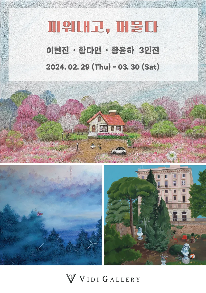 전시 개요 OVERVIEW 비디갤러리에서는 02월 29일부터 03월 30일까지 이현진, 황다연, 황윤하 작가의 3인 기획 초대전인 <피워내고, 머물다>를 진행한다. 이현진 작가의 연작 ‘숨겨진 세상’은 여행을 하며 발견한 새로운 이미지들을 조합해 ‘나만의 공간’으로 재구성하는 방식으로 탄생하였다. 새롭게 구성된 풍경에는 작은 자동차와 기차, 그리고 장난감들이 부유하고 있는데, 이는 어딘 가에 정착하지 못해 불안정한 상태인 현대인들의 현실을 무겁지 않은 분위기로 나타내 주고 있다. 잎들 사이사이를 활보하는 여러 장난감과 피규어들을 작품 속에 장치해 둔 작가만의 현실도피 단서들이며, 무거운 현실의 짐을 내려놓게 해준다. 우리는 삶을 살아가며 많은 역할들을 수행하게 되는데, 작가는 그러한 역할들이 힘겹고 버거울 때면 현실에서 벗어나 화면 안에 비현실적인 상상의 세계를 표현함으로써 현실도피의 희열을 느낀다. 깊은 숲 속 안개가 피어오르는 신비로운 세상을 통해 감상자들은 각자의 숨겨진 세상을 들여다보고, 보살필 수 있는 계기를 마련하게 된다. 현실과 이상의 경계를 넘나들며 만들어진 ‘숨겨진 세상’ 속의 재치 있는 요소들을 즐기며, 재미있는 상상과 함께 우리의 현실을 극복하며 살아가기를 기대해 본다. 황다연 작가가 그려낸 파라다이스는 영원히 충족되지 않을 현대인들의 욕구와 갈망 속에서 만들어졌다. 이때의 낙원은 실재하는 공간이며, 작가의 개인적인 기억과 상상을 더해 현실 공간 속으로 이상적인 자연을 가져온다. 누구나 한 번쯤은 가보았던 곳, 어딘지 모르지만 익숙한 장소들이 낙원처럼 느껴지며, 평범한 장소에서 판토피아(Pantopia)를 꿈꾸게 된다. 그러나 작품 속에 등장하는 석고상, 선인장 등의 이질적인 오브제들은 이 세계가 온전한 유토피아가 아님을 시사하고 있다. 현재를 각성하게 하는 오브제들을 구성함으로써, 관람자들은 파라다이스가 허구임을, 이상향은 없는 것임을 느끼게 된다. 이질적인 오브제들을 통해 파라다이스가 허구임을 알게 되는 것은 불쾌를 동반하지만, 곧 이 불쾌감이 해소될 때 개인의 욕망은 표면 위로 드러난다. 지금 어딘가에 있을지 모르는 초월적인 유토피아보다 언제 어디서나 존재할 수 있는 판토피아(Pantopia) 속에서 관람객은 스스로의 파라다이스를 전개하고 관철시킬 수 있다. 이것은 역설적이게도 파라다이스의 실존을 더욱 간절하게 불러일으킬 수 있으며, 자신만의 세계에 대해 고민하고, 관조하는데 관심을 두게 될 것이다. 황윤하 작가의 ‘아름다운 집’ 시리즈는 자연과 집, 그리고 집에서 살아가는 사람들의 성장 과정을 아름답게 표현한 작품이다. 자연으로 둘러싸인 집은 사람이 살고 있을 때 아름다움이 극대화된다. 인간은 희로애락으로 가득한 삶의 과정을 통해 성장하기 때문에, 멀리서 인생을 바라보면 그 모든 순간이 가치 있고 소중하다. 자연은 그러한 삶을 둘러싸며 눈부신 사계절의 변화를 보여준다. 사계절은 우리에게 주어진 축복의 시간이라는 것을 전제로, 작가는 인생이라는 여행길에서 계절의 순리를 따르며 평화롭고 아름답게 살아가는 모습을 묘사하였다. 또한 저물어가는 밤과 움츠러드는 겨울까지도 그 모든 삶을 포근히 감싸 안은 따뜻한 서정미로 사람에 대한 사랑과 긍휼의 마음을 작품에 담아내길 원하였다. 자연은 우리 곁에서 삶을 포근히 감싸 안고 휴식과 위안을 주면서 마치 이렇게 말하는 것 같다. “영원함은 없는 유한한 인생이지만, 우리 한 번 이번 삶을 아름답게 살아보지 않을래?”