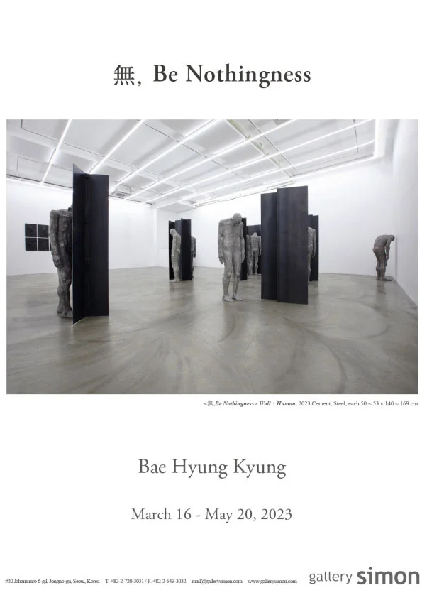 전시 개요 OVERVIEW 갤러리시몬은 2023년 3월 16일부터 5월 20일까지 배형경 작가의 개인전 ‘無, Be Nothingness’를 개최합니다. 인간의 실존에 대해 끊임없이 사유해온 작가는 이번 전시를 통해 ‘벽 앞의 인간’, ‘또 다른 인간’, 그리고 ‘같음’이라는 세 가지의 주제를 선보입니다. 인간이 태어나 내면의 벽과 물리적인 벽을 수없이 직면하며 끝없이 헤매다 사라지는 존재임을 암시합니다. ‘사라짐’을 말하고 있는, 움직이기도 쉽지 않은 견고하고 강인한 조각들은 또한 각자에게 주어진 삶의 무게를 나타냅니다. 키가 각각 다른 사람들은 그들이 디디고 선 바닥의 다른 높이 때문에 동등하지 않은 눈높이를 가집니다. 그러나 서로 다른 개체임에도 불구하고 인간이라는 존재로서 가지는 동일성은 모든 것이 無로 향해가는 삶의 여정 속에서 우리 모두 같음을 인지하고, 선함을 향해 나아가야 한다는 방향성을 제시합니다.