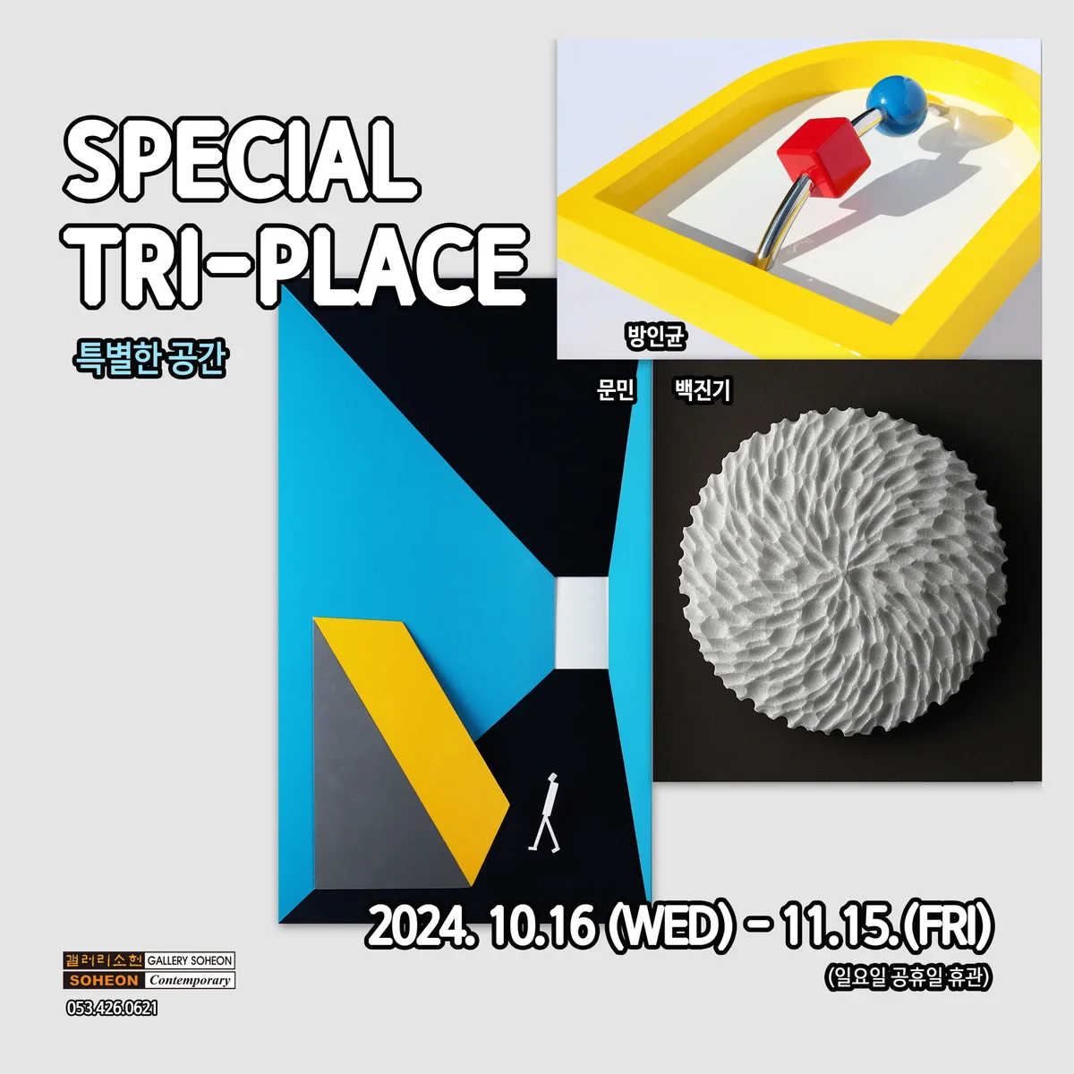전시 개요 OVERVIEW 조각가들이 만들어내는 드라마틱하고 특별한 예술공간 지성과 감성이 높아지는 가을, 오감(五感)만족을, 조각으로 특별한 공간을 구성한 전시 조각가들이 만들어내는 드라마틱하고 특별한 예술공간 지성과 감성이 높아지는 가을, 오감(五感)만족을 드릴 조각으로 특별한 공간을 구성한 전시 높아지는 가을 하늘처럼 지성과 감성을 두루 만족시키는 특별한 트리플레이스 (Triplace)로 미술애호가들의 발걸음을 사로잡는 갤러리가 있다. 전시는 ‘Special Tri-place 특별한 공간’이 라는 이름으로 대봉동 갤러리소헌에서 열린다. 한국 미술시장에서 활발하게 활동하고 있는 유망한 조각가 백진기, 문민, 방인균, 세 명의 예술가들이 각자 주어진 공간을 자신들의 다양한 작품으로 드라마틱하고 특별한 공간으로 연출하여 보여준다. 자연과 인간, 상상을 소재로 한 미니멀한 조각에서부터 톡톡 튀는 원색 컬러의 팝아트 조각까지 다양한 스펙트럼으로 관람객을 맞이할 이번 전시는 기존 그룹전의 형식과는 달리 새로운 방향으로 접근한다. 각각의 작가들이 뚜렷한 자기 색깔을 마음껏 발휘하면서 각자의 색깔이 모여 각자의 공간을 만들고 이 공간들이 모여 전체의 하모니를 이루는 새로운 시도이다. 화이트 큐브 전시장에 공간을 나누어 각자의 색이 뚜렷한 작가들의 대표 작품들을 전시장의 벽면과 바닥을 모두 활용한 자유로운 작품 설치를 통해 각 작가의 ‘공간’에 구현하고, 각각의 공간들이 어우러져 만들어내는 전체적인 조화로움이 감상 포인트가 된다. ‘백진기’ 조각가는 대리석 조각 예술의 본고장인 이태리 카라라에 거주하였고, 국립 미술학교(L’accademia di belle art di Carrara)에서 수학하며 알피 아푸아네(Alpi Appuane) 산맥의 거대한 대리석산에 매료되었다. 빛과 바람, 물과 땅의 생명력이 고스란히 응축된 돌을 쪼개고 다듬어 만든 그의 조각에는 자연의 근원적 원리와 초월(超越)의 심오한 감각이 더해져 있다. 그렇게 반복적이고 고된 조각 행위를 구도(求道)와 성찰의 밑거름으로 삼아 진한 형이상학적 여운과 미적 감동을 자아낸다. 작가는 변하지 않는 본질적 색상, 그리고 고결한 무늬가 살아 숨쉬는 대리석 표면에 무수한 점을 새겨넣고, 때로는 표면의 질감과 굴곡을 통해 생동감 있는 움직임을 표현한다. 원환(圓環)의 영원한 고리 속에 만물의 삶을 추상(抽象)해내는 작가의 작품은 이번에도 관객에게 존재와 세계의 충만한 일체감을 맛보게 해 줄 것이다. 대리석이 주는 고급스러운 순백색의 아름다움과 작가의 손길에서 만들어낸 생명력이 살아 숨쉬는 백진기의 추상 조각은 다양한 공공장소에서도 사랑받고 있는데 특히 상하이 상그릴라 호텔, 소피텔 엠버서더, 롯데호텔 서울 신관, 롯데호텔 제주 등 클래식하고 격조 있는 분위기가 필요한 공간에 주로 소장되어있다. ‘문민’ 조각가는 소통이 단절된 사각형으로 그려진 현대 사회 속에 살아가는 인간의 모습을 비유적으로 표현하여 각박한 현실 속에 살고 있는 우리의 ‘소통과 관계성’ 이야기를 담아낸다. 작가는 축조된 사각형 프레임 속에 수평과 수직의 도형으로 공간을 갈라 사회를 만든다. 그 공간 속의 주인공은 사색하거나, 앉아있거나 걸어가는 등 단순하게 표현된 눈코입이 없는 인체로서 작가와 감상자, 그리고 우리 모두를 뜻한다. 미니멀한 형태와 색조로 표현된 사각형의 인간과 사각형의 세상은 절제되어 있으면서도 감성적이고, 슬프면서도 고독하다. 사람들은 과거와 현재, 미래가 혼재하는 불확실하고 모호한 경계 속에 흔들리며 살아간다. 세상은 차가운 직선과 각으로 둘러싸인 끝없는 인내의 장이며 끝나지 않는 뫼비우스의 띠와 같다. 작가는 직관적인 시선을 통해 동시대에 공존하고 있는 무수한 것들을 조형적 언어로 표현하고 현시대를 기록하고자 한다. ‘문민’ 조각가는 전북대학교 미술학과 조소전공 및 동 대학원과 박사과정을 수료하고 전북도립미술관 전시를 비롯 다양한 미술관 전시들에 참여하는 등 활발히 활동 중이다. ‘방인균’ 조각가는 ‘영원히 맛볼 수 있는’ 사랑스러운 케이크 조각과 어린 시절
