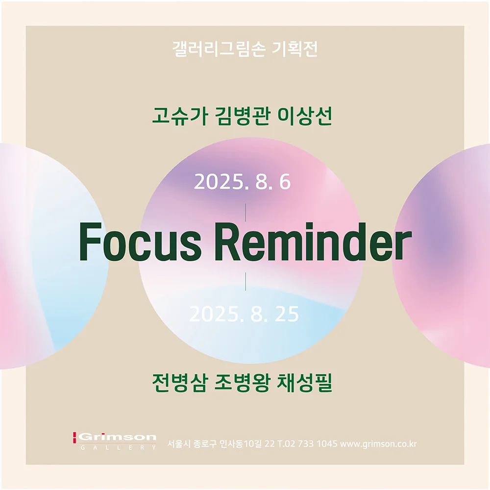 전시 개요 OVERVIEW 갤러리그림손은 8월 여름, 여섯 명의 중견 현대미술 작가들과 함께하는 특별한 전시를 개최합니다. 이번 전시는, 오랜 시간 자신만의 작업 세계를 구축해 온 40~50대 작가들의 내공과 에너지를 조명하는 전시이며 작가들은 갤러리그림손과 함께 전시, 아트페어, 해외 프로모션 등 다양한 활동을 통해 현대미술의 흐름을 이끌어 온 주역들입니다. 참여 작가들 대부분은 20대에 작업을 시작하여 끊임없이 자기개발과 창작성을 연구, 탐구하며 자신이 보여주고자 하는 지금의 작업으로 나아왔습니다. 40대 이후의 시기는 작가에게 있어 자신의 예술세계를 더욱 확고히 다지는 시간이며, 미술시장에서 주목을 받거나 새로운 전환점을 맞이하는 시기이기도 합니다. 물론, 새로운 변화에 대한 작업의 과정은 작가에게 영원한 과제이며, 삶입니다. 이렇게 자신의 작업을 탄탄히 쌓아가면서 새로운 도전에 대한 믿음과 변화하는 것을 두려워 하지 않는 작가들이 한국 미술시장의 주축이 될 수 있는 것입니다. 이번 갤러리그림손에서 전시하는 여섯 명의 작가—고슈가, 김병관, 이상선, 전병삼, 조병왕, 채성필—는 각자의 작업방식으로 작가적 개념과 미학적 이론을 사유하며 자신만의 언어로 풀어내고 있는 작가들입니다. 각자가 바라보는 시각과 생각은 개인의 경험을 바탕으로 자신의 내면에서 시작된 작업들입니다. 이러한 작업들은 이미 미술관계자들과 관람객들에게 익숙할 수도 있으며, 새롭게 다가오는 작품들도 있을 것입니다. 이번 전시의 타이틀인 < Focus Reminder >는 익숙함을 넘어선 다시 집중해서 작업을 바라보라는 취지입니다. 기존에 알고 있던 시선보다는 새로운 시각으로 작가들이 말하고자 하는 개념과 우리들이 바라보는 이해의 시각으로 작품을 접하기를 바라는 의미입니다. 우리가 주목해야 할 부분들이 무엇이며, 우리는 작품과 마주하면서 무엇을 느껴야 하는지, 물론 모든 작품에서 무엇을 깨닫고 느껴야 하는 건 아닙니다. 다만, 작품을 바라보면서 자신과 작가의 마음이 함께 감정이입 되는 시간이길 바랍니다. 고슈가, 김병관, 이상선, 전병삼, 조병왕, 채성필 6명의 작가를 통해 작품의 개념과 미학을 더 깊이 이해하고, 감상의 폭을 넓히는 시간이 되기를 기대하며 이번 < Focus Reminder > 전시를 통해 한국 현대미술의 깊이와 지속 가능한 힘을 경험하길 바랍니다